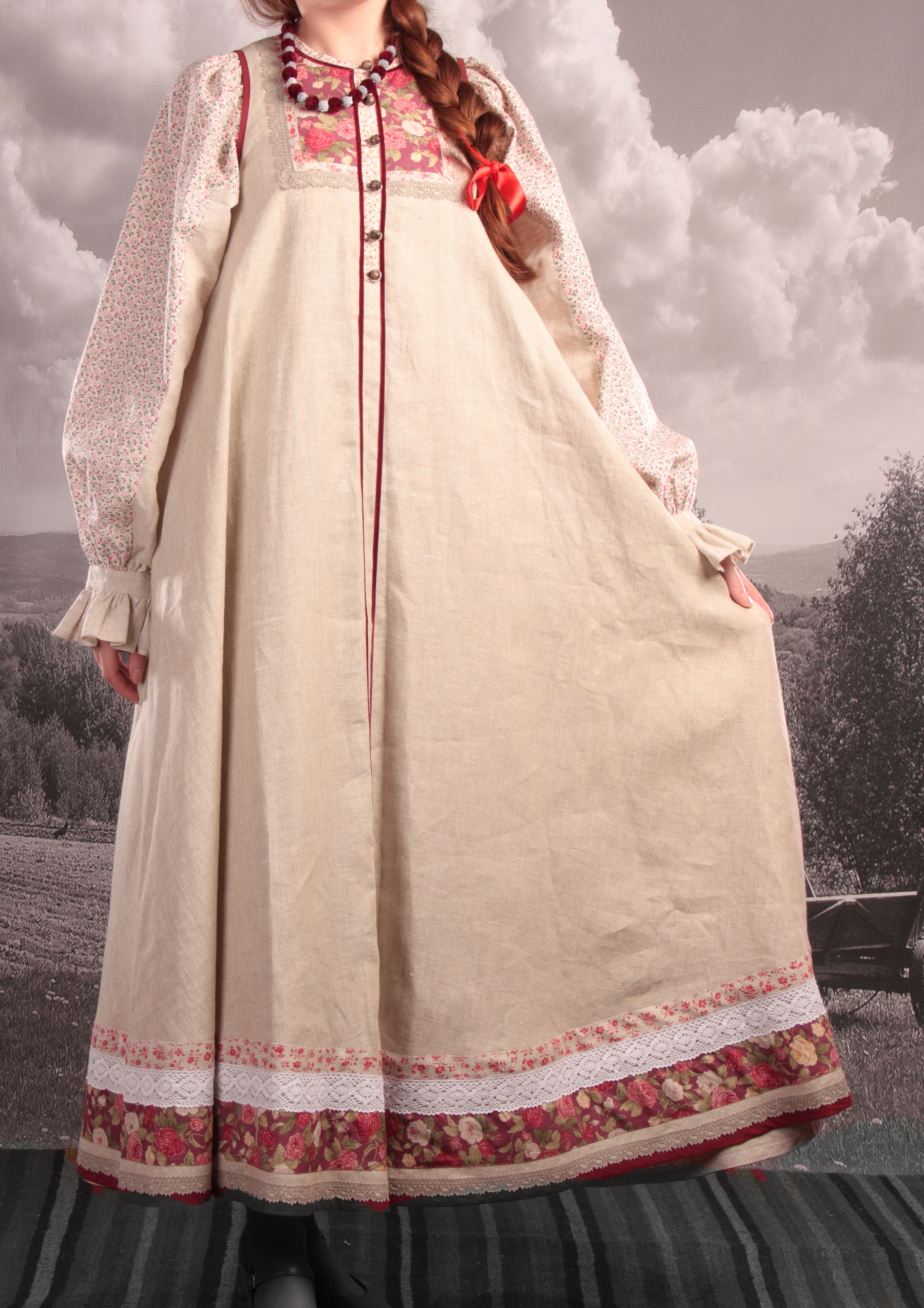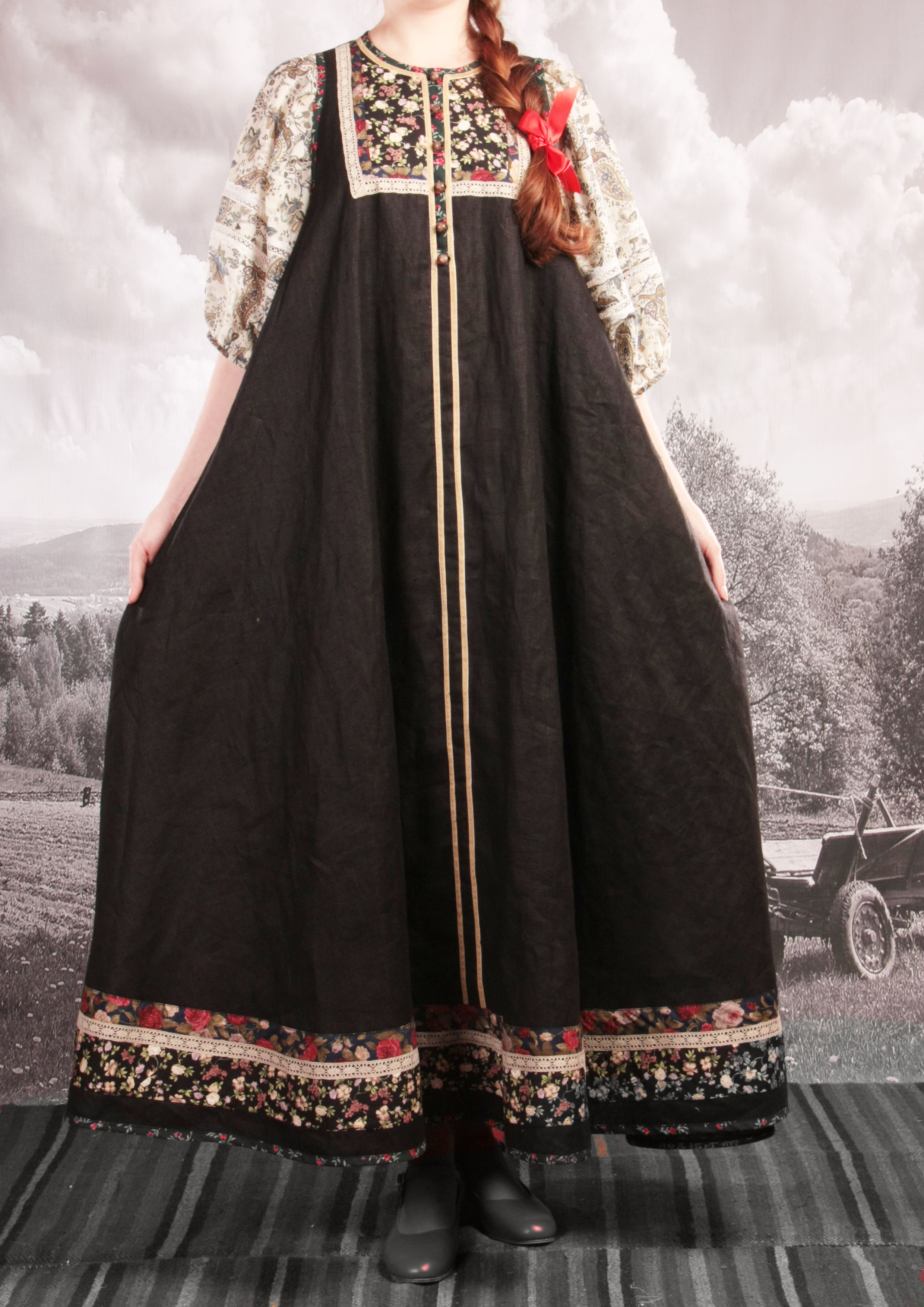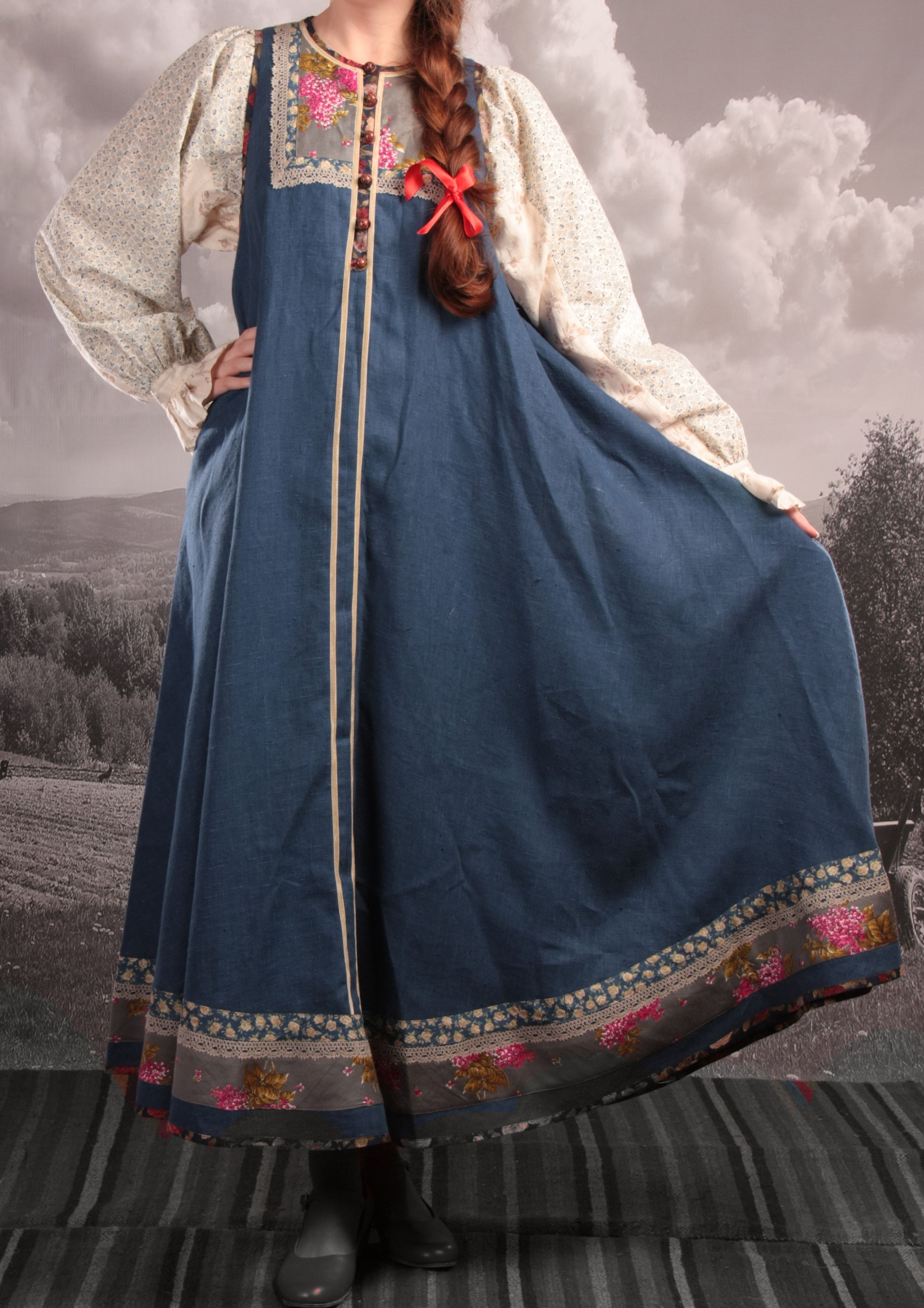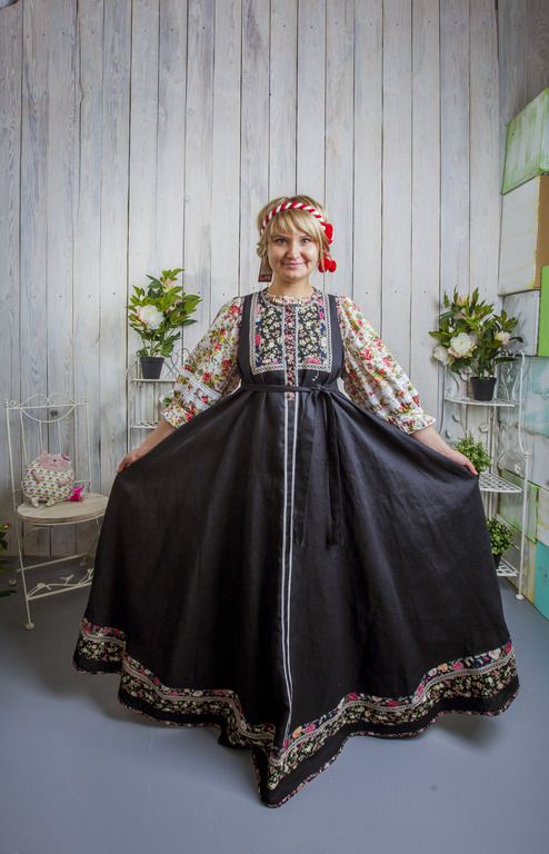 Сарафан в русском стиле, старинный крой. Богато оформленная гарловина, цветочная ткань по подолу.