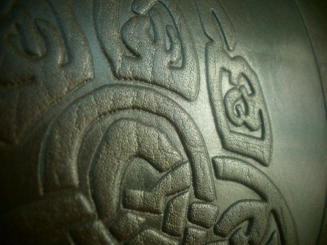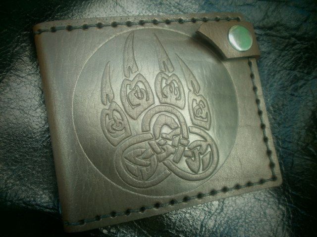 2 отделения для купюр, отделение для карточек (вмещает около 10 шт), отделение для мелочи. Ручная прошивка сапожной нитью, тиснение. На кошельке нанесен "Печать Велеса" как один из самых сильных символов родной культуры.