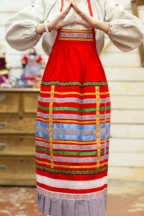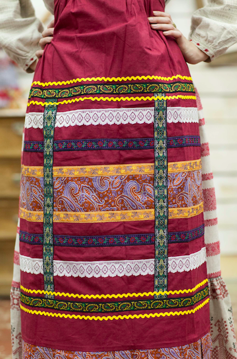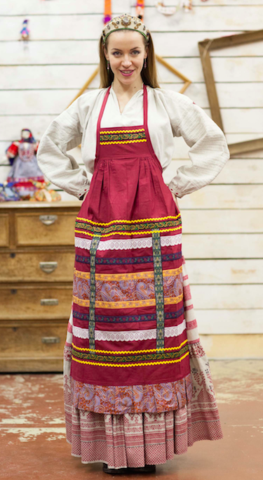 В наличии есть московский передник и новгородский. Московский красный, Новгородский коричневый.