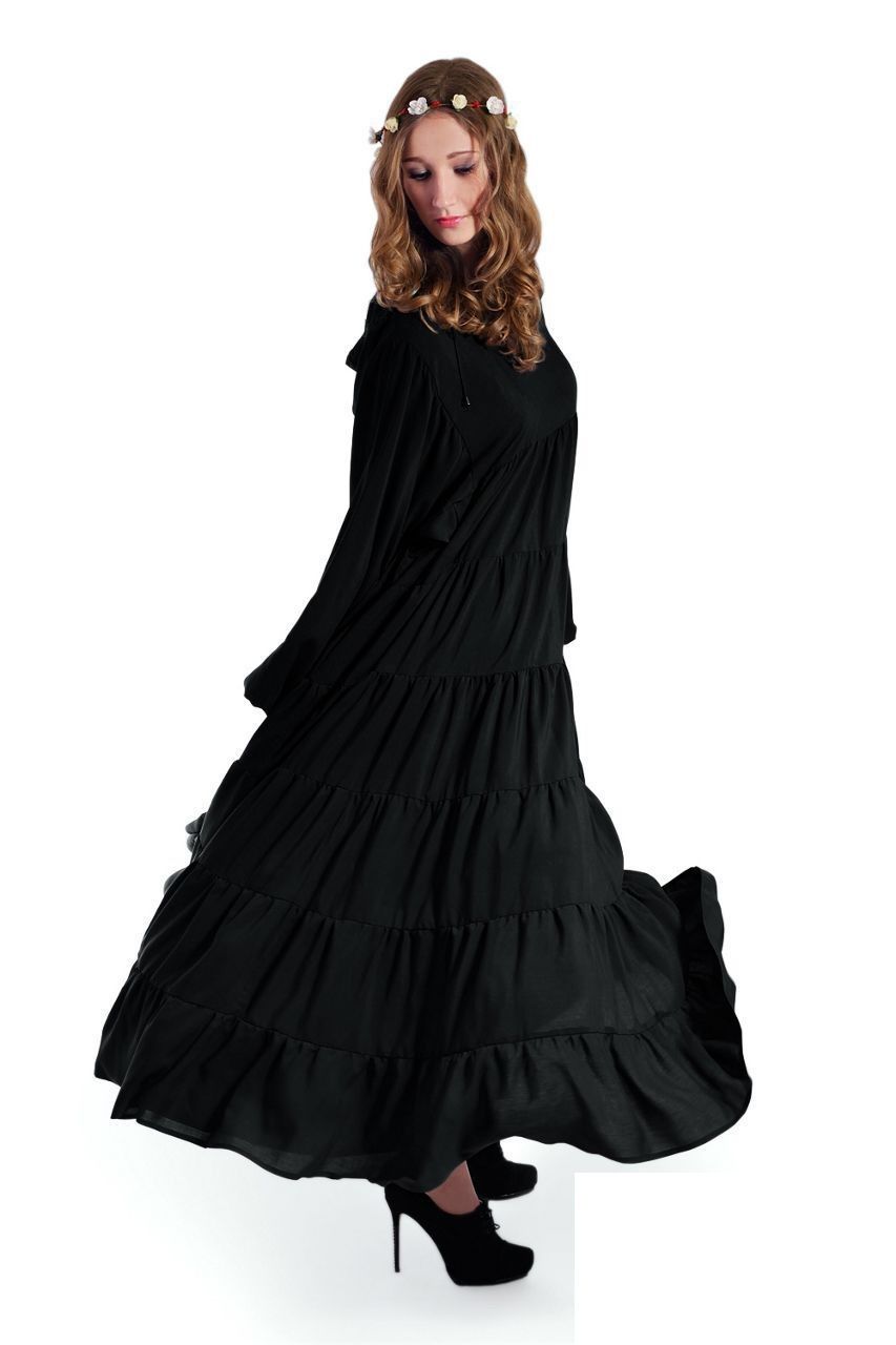 Длинное ярусное платье в пол, сшито из однотонного штапеля чёрного цвета.