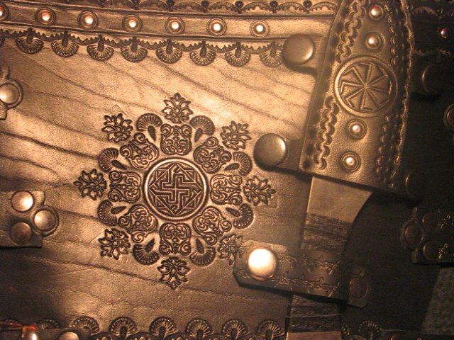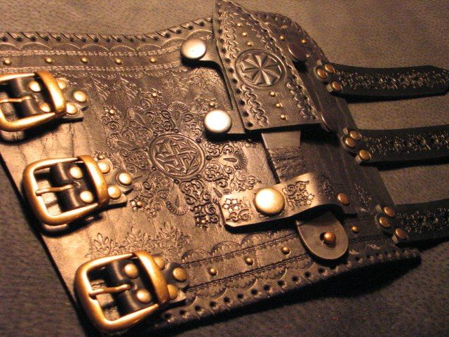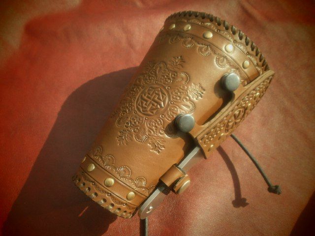 Для прекрасного пола. Сам наруч невелик и нож несколько меньше обычного. Тиснение с цветочками и клепочки поизящней)).