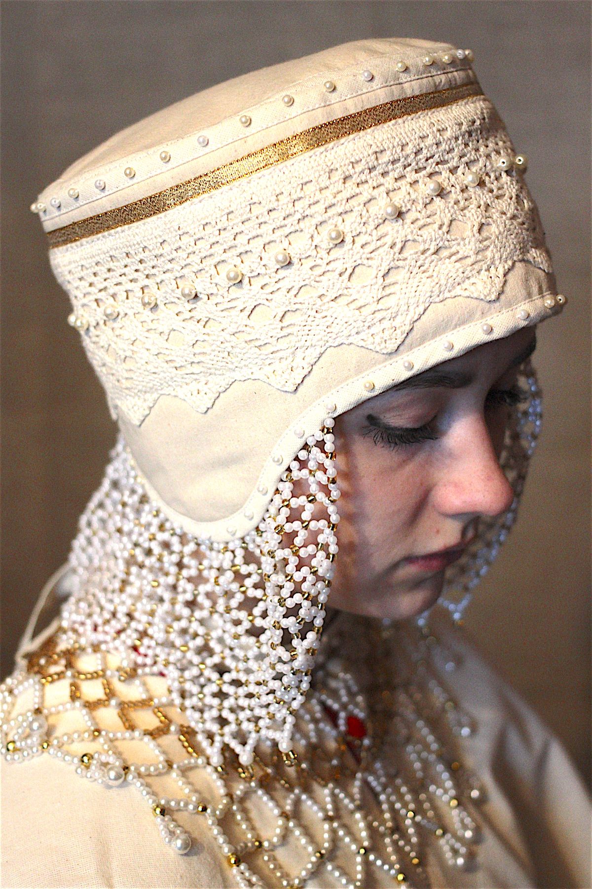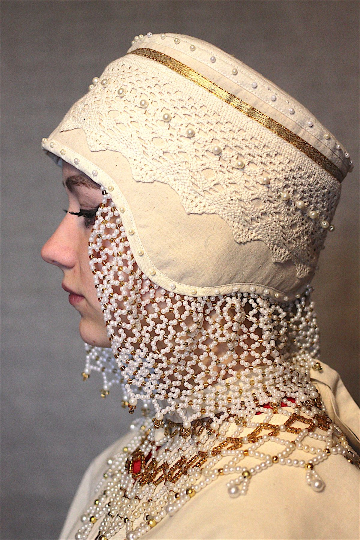 Повойник с жемчугами является праздничной, очень нарядной одеждой. Он не только украшен позатыльнем, но и ряснами. Рясны - это нарядные подвески ниже плеч, которыми во многих веках украшался русский костюм. Повойник выполнен в методике многослойного шитья из небеленого холста, который прекрасно сочетается с жемчугами. Носить повойник рекомендуется на праздники, для свадебных обрядов, на торжества в храм, и в другие места, где хозяйка хочет быть самой красивой.