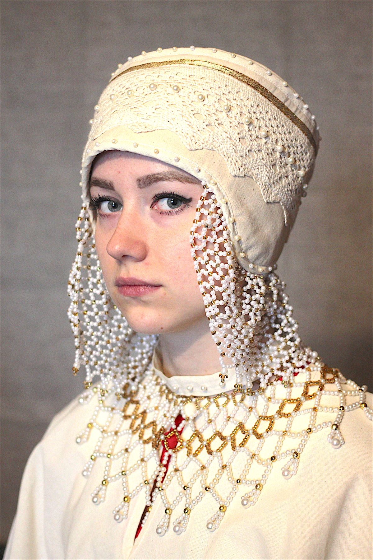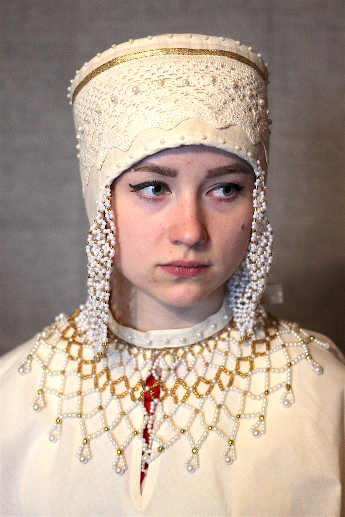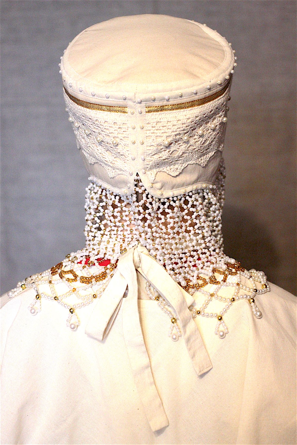 Материалы: лён, небеленый холст, кремовый шелк, ткань с золотом, жемчуг, бисер.