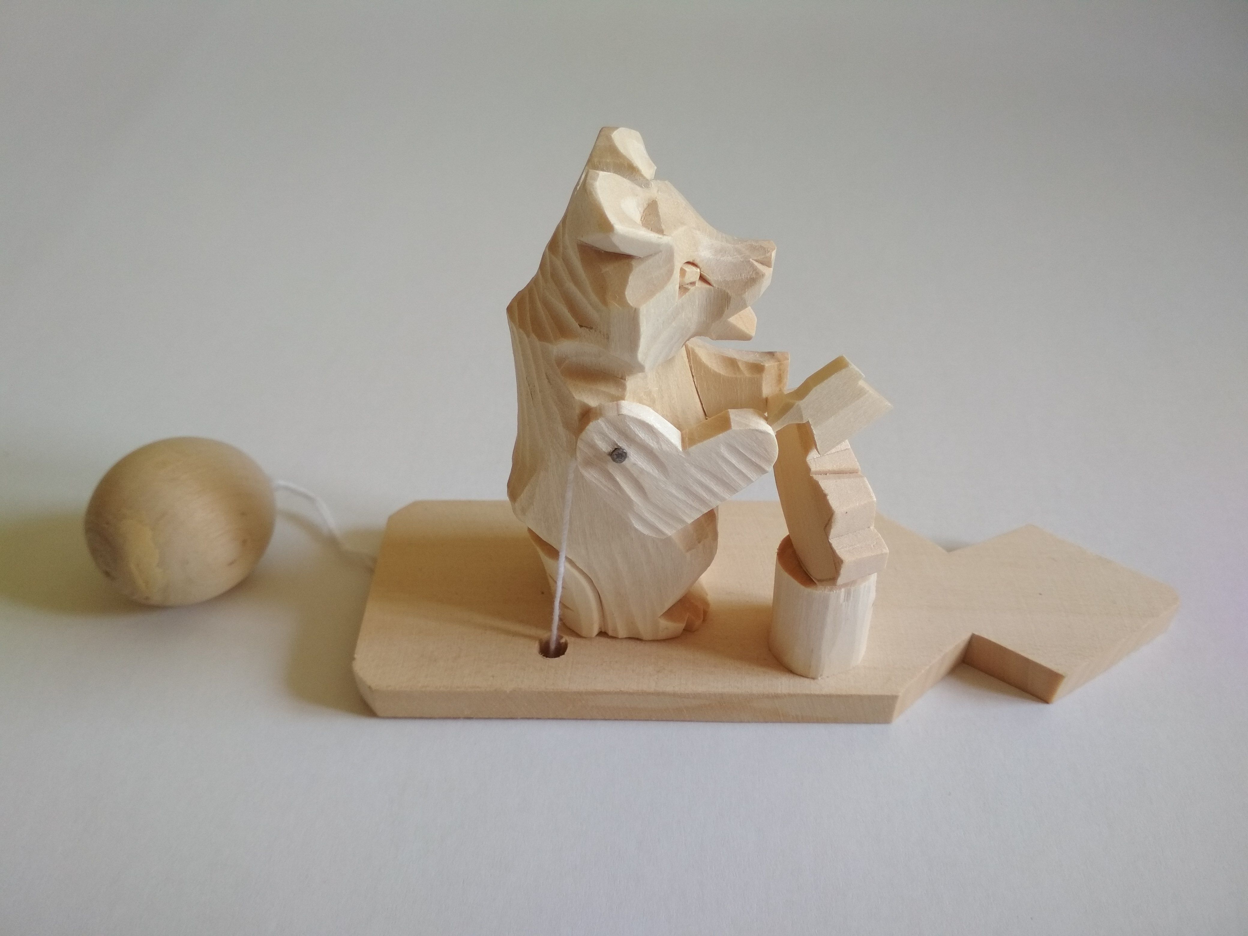Еще одной известной поделкой считаются «Курочки». Ее отличительной особенностью является планка и баланс, который приводит конструкцию в движение. В результате выполненных движений птицы по очереди начинают клевать зерно. Сюжеты таких игрушек неслучайны, ведь большинство из них крестьяне черпали из собственной жизни, а также народных сказок. Именно в них в качестве героев выступали: медведь, простой деревенский мужик, птицы.