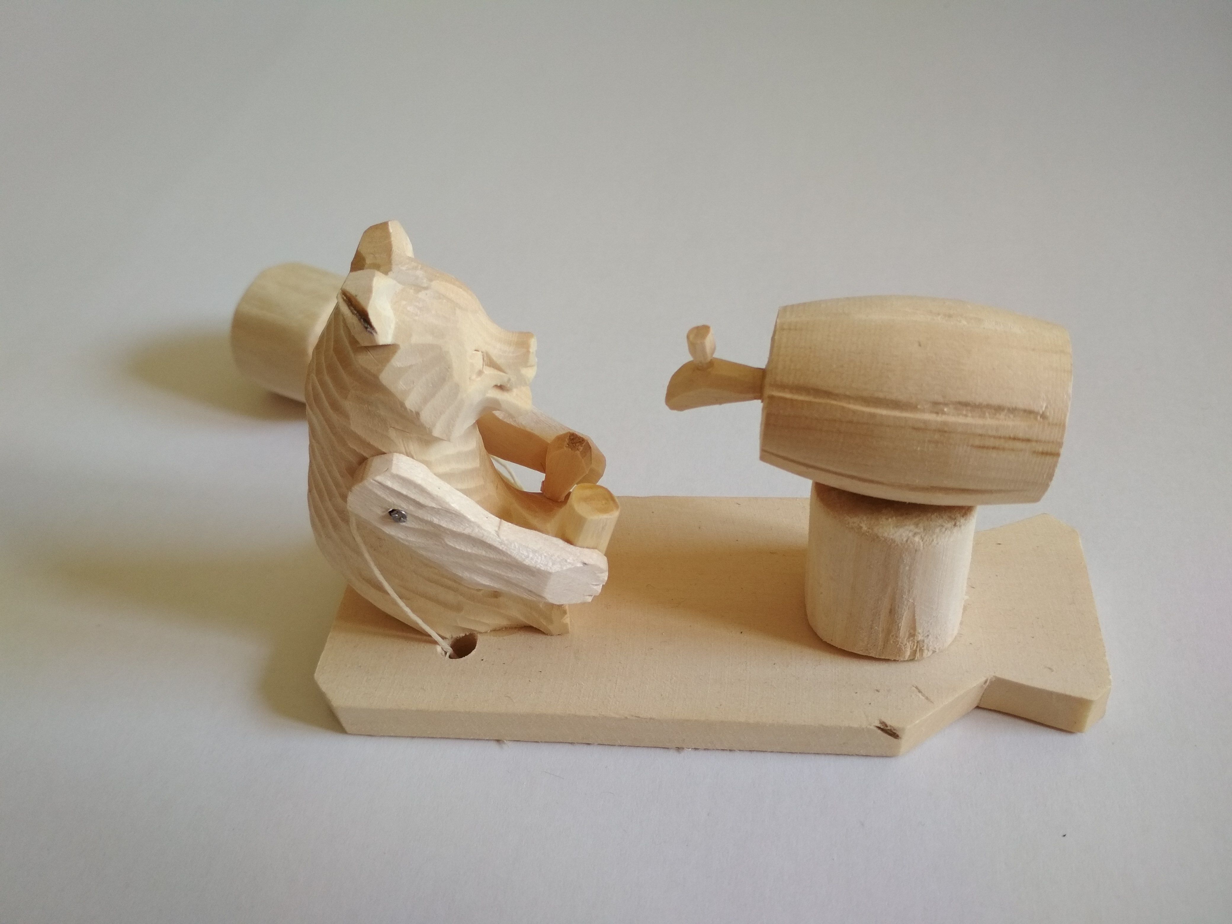 Еще одной известной поделкой считаются «Курочки». Ее отличительной особенностью является планка и баланс, который приводит конструкцию в движение. В результате выполненных движений птицы по очереди начинают клевать зерно. Сюжеты таких игрушек неслучайны, ведь большинство из них крестьяне черпали из собственной жизни, а также народных сказок. Именно в них в качестве героев выступали: медведь, простой деревенский мужик, птицы.