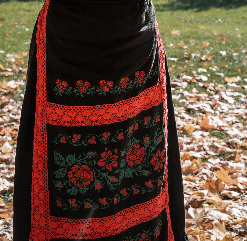 Праздничный фартук с вышивкой в виде красных цветов на черном фоне.