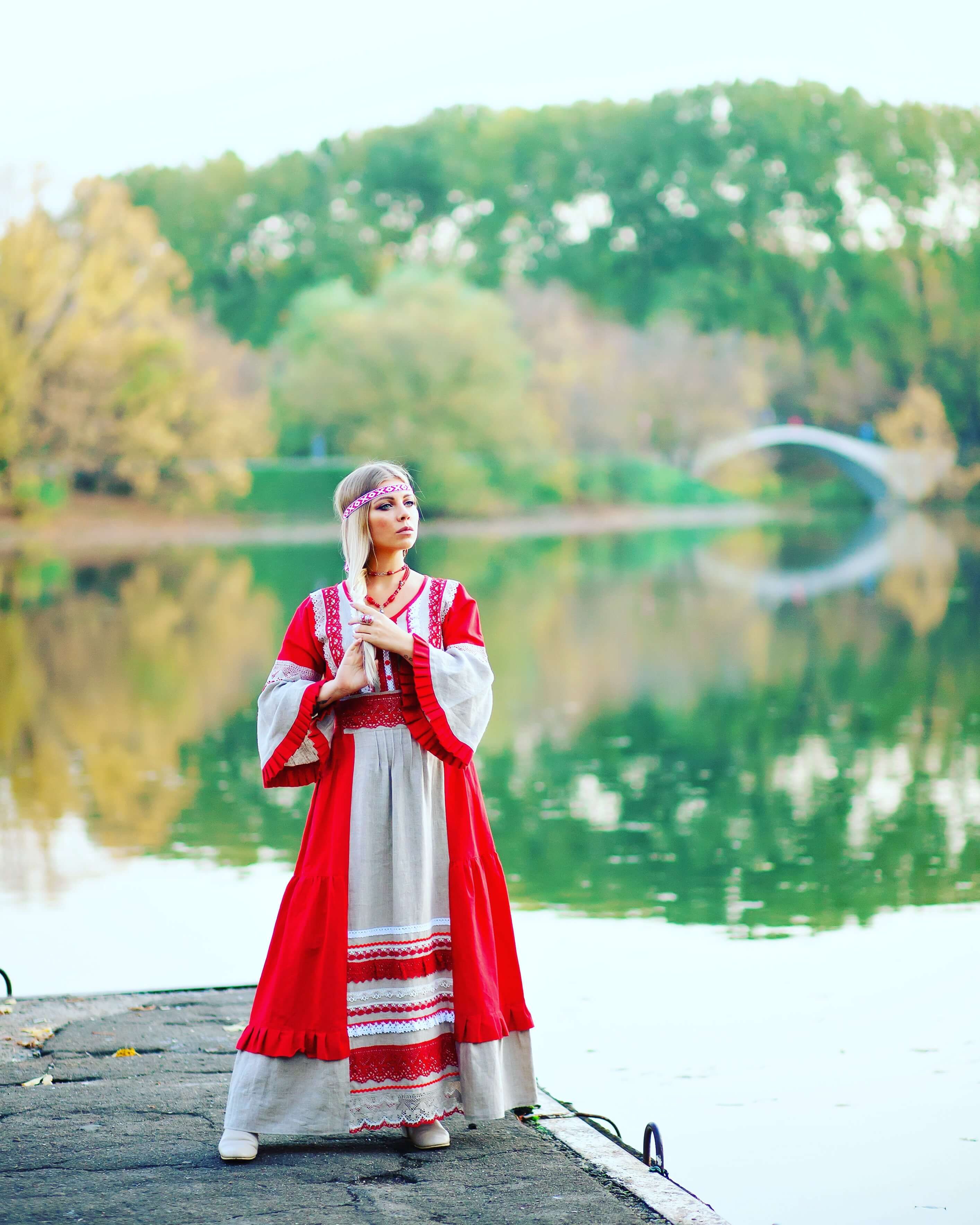 Роскошное славянское платье, с рукавом как из сказки.