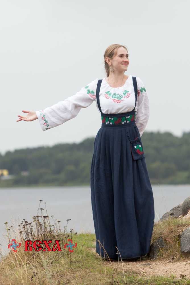 100% синий лён, с вышивкой в виде цвета Калины.