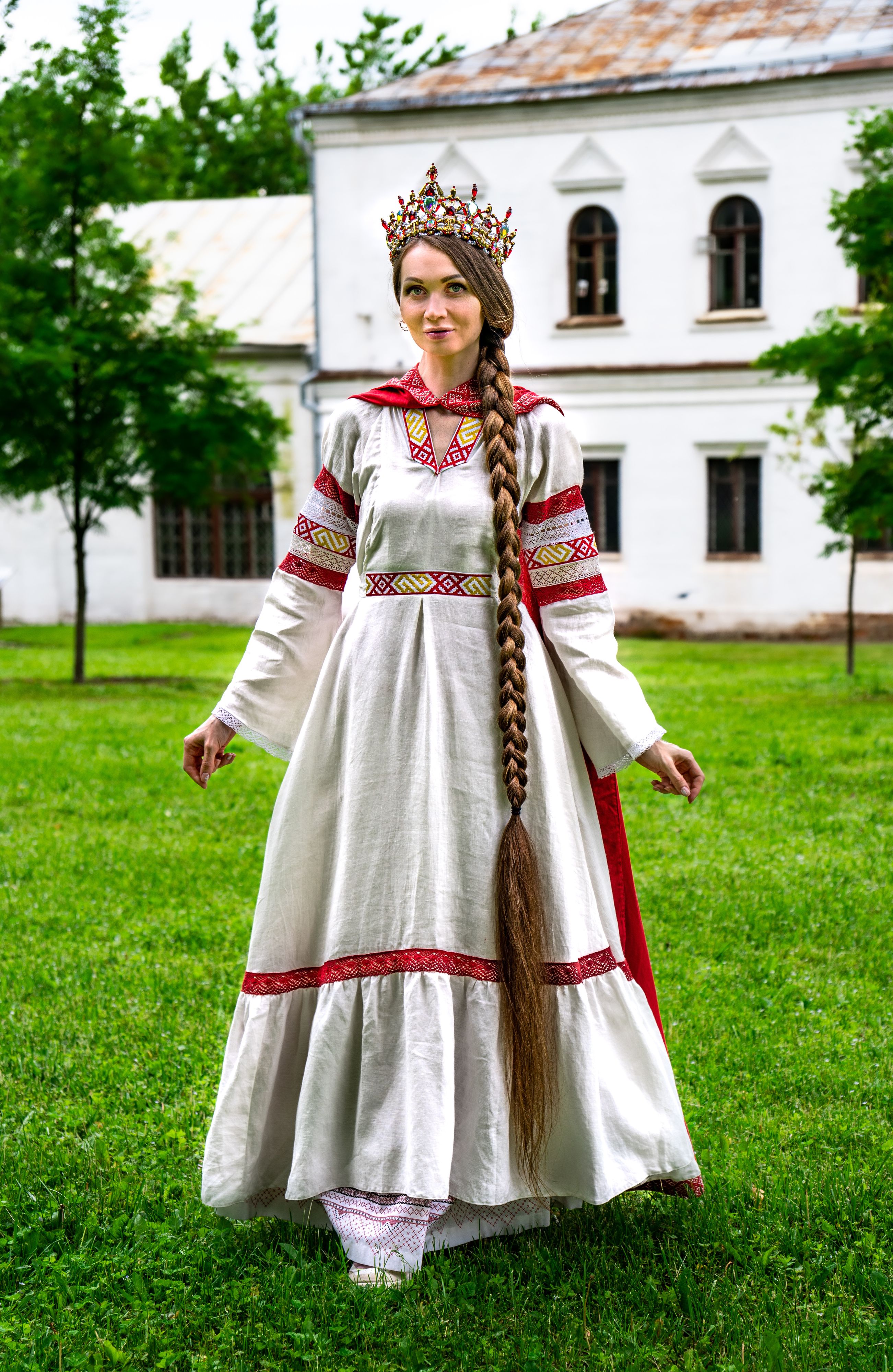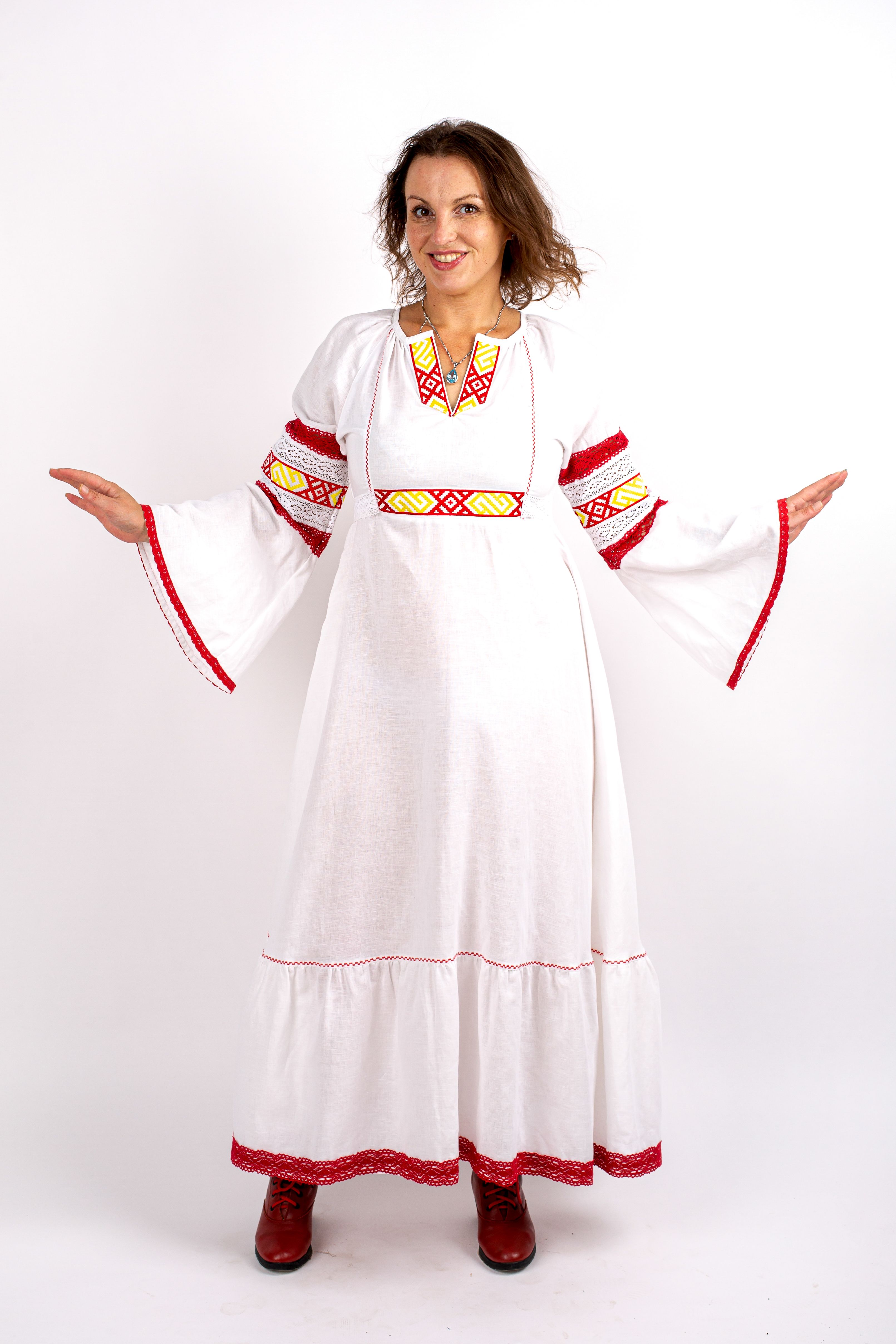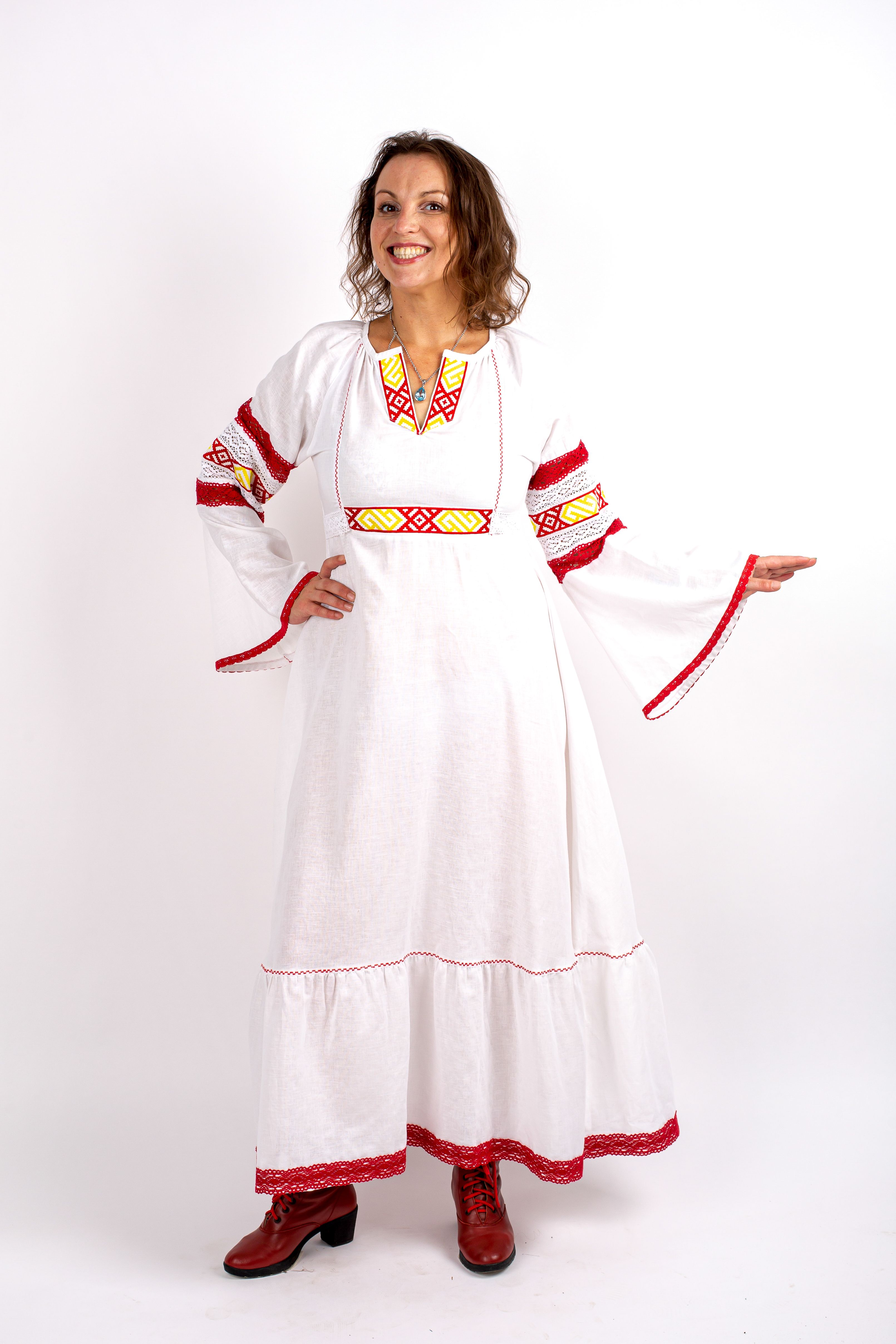Льняное платье с вышивкой расширяющего орнамента, натуральным кружевом, прошитыми вручную швами для еще большей энергии. Платье вызывает особую любовь к себе у самой женщины и всех окружающих.