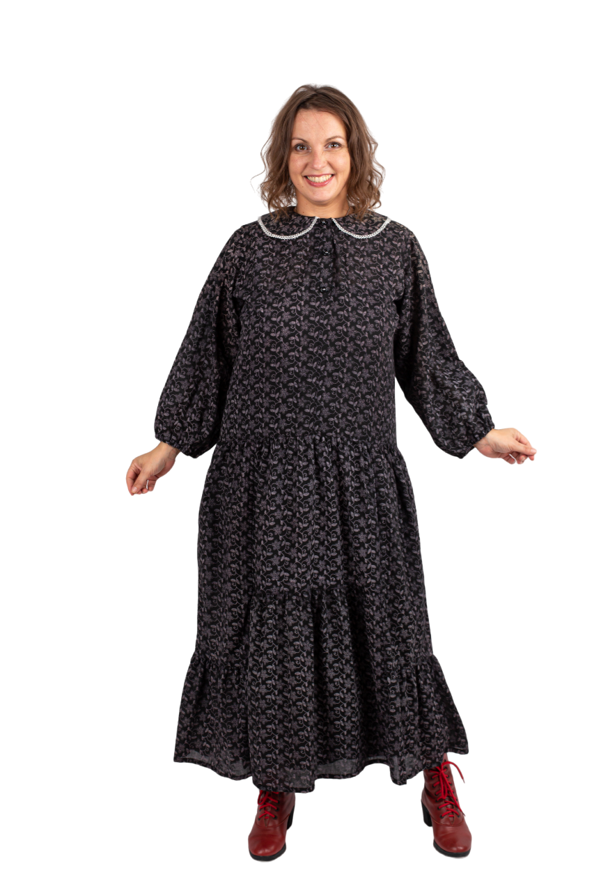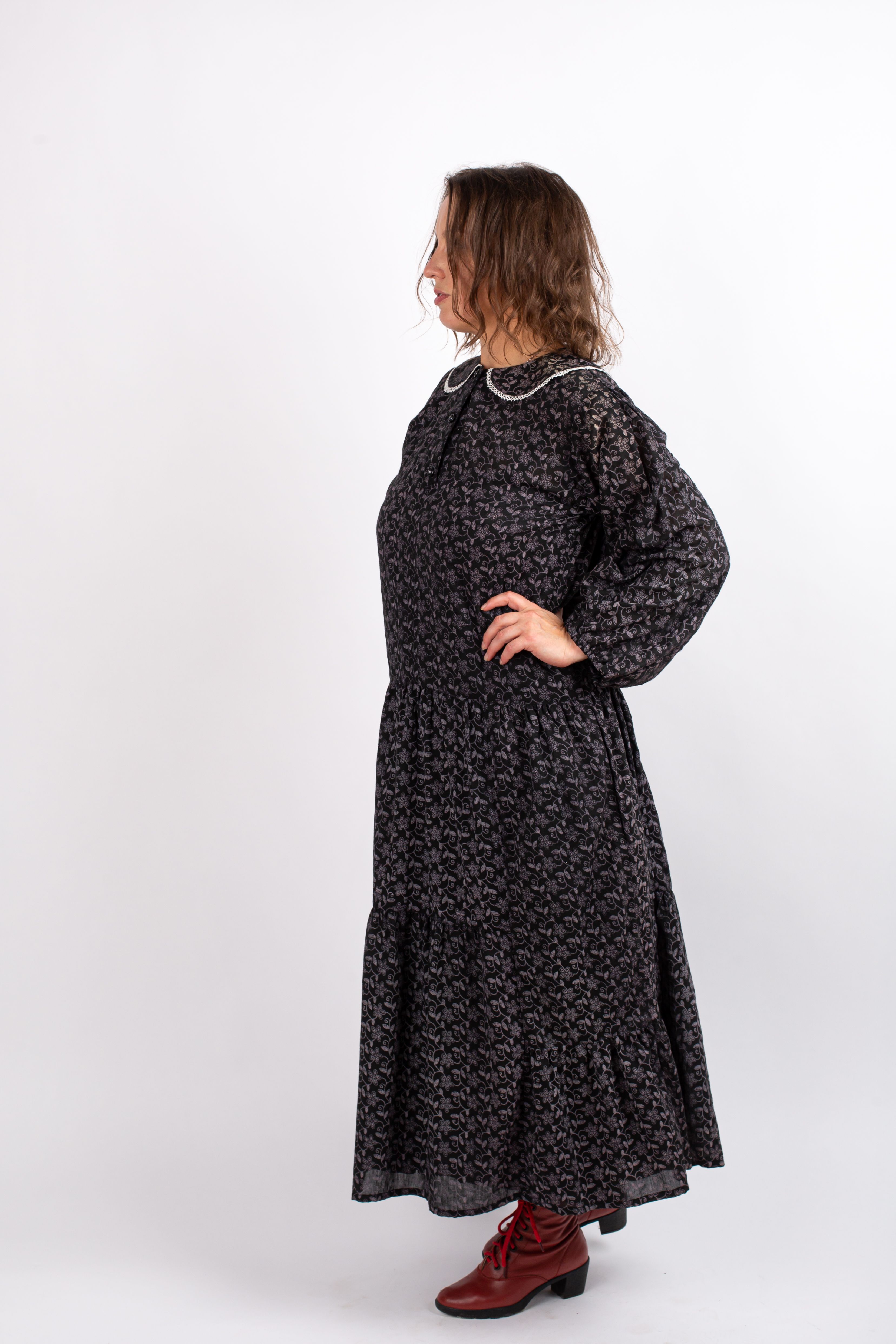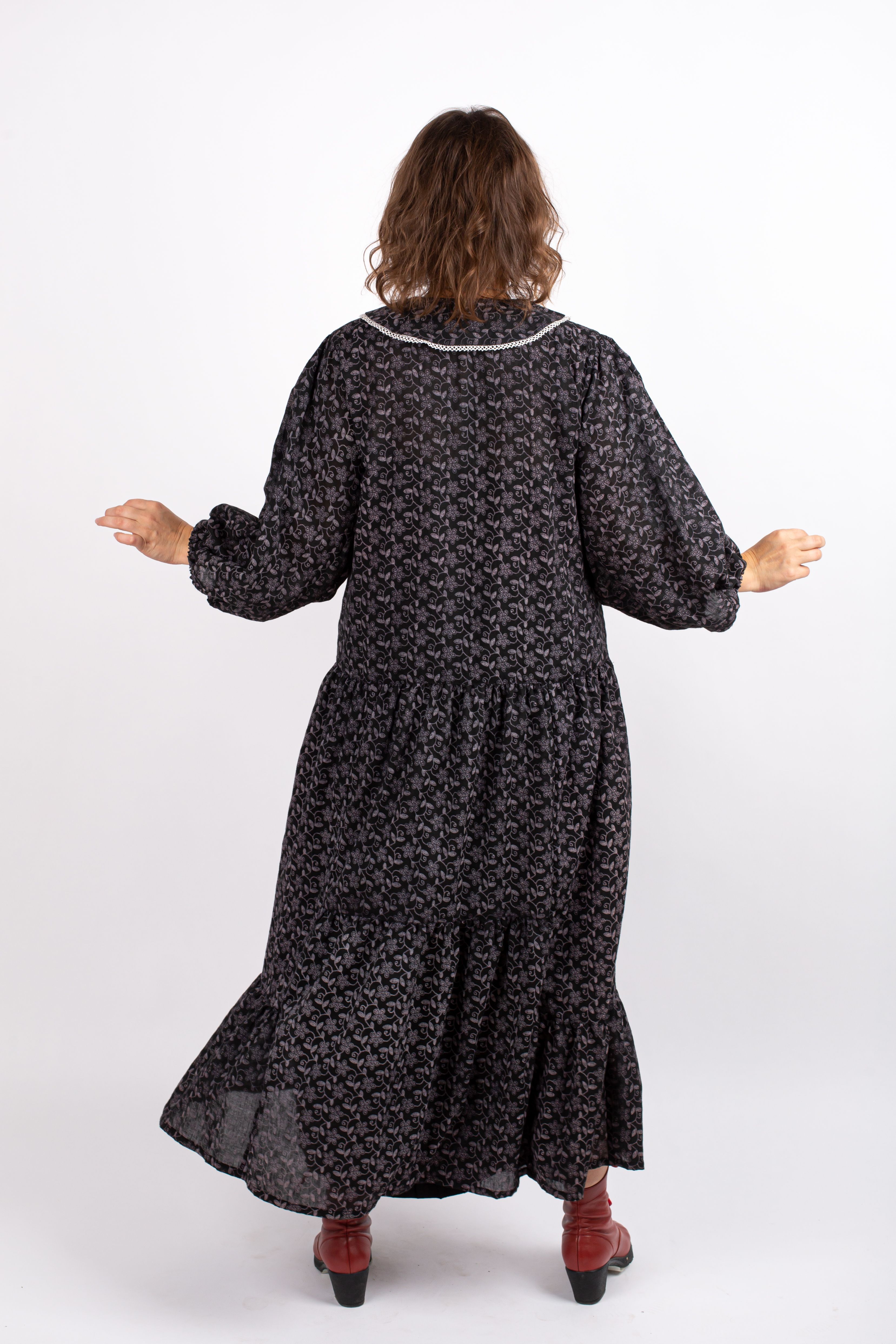Оригинальный крой с двумя воланами, пышным рукавом и изящным воротничком с белым кружевом.