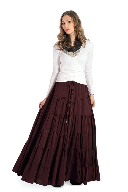 Ярусная длинная юбка в русском стиле сшита из однотонного штапеля.
