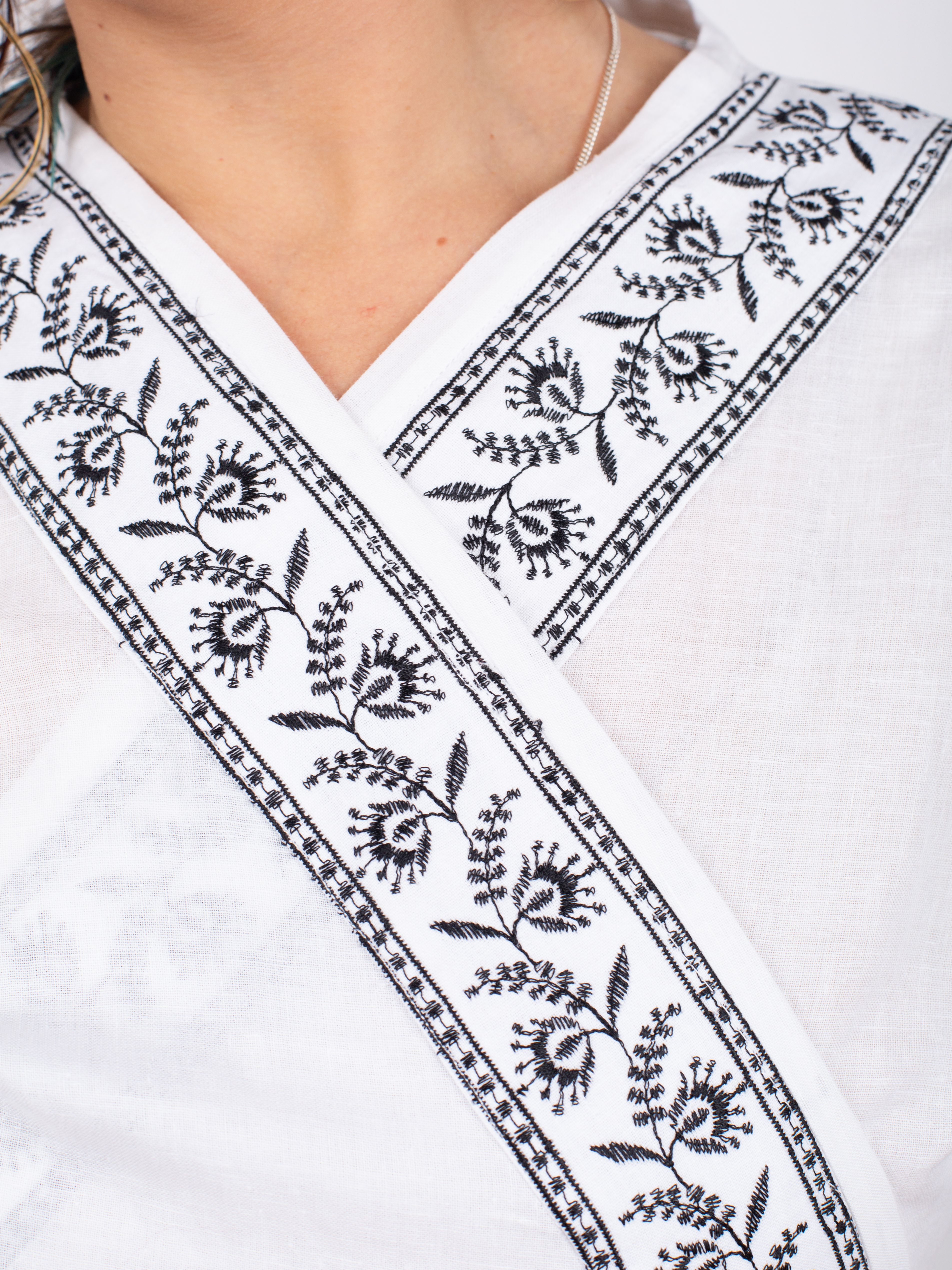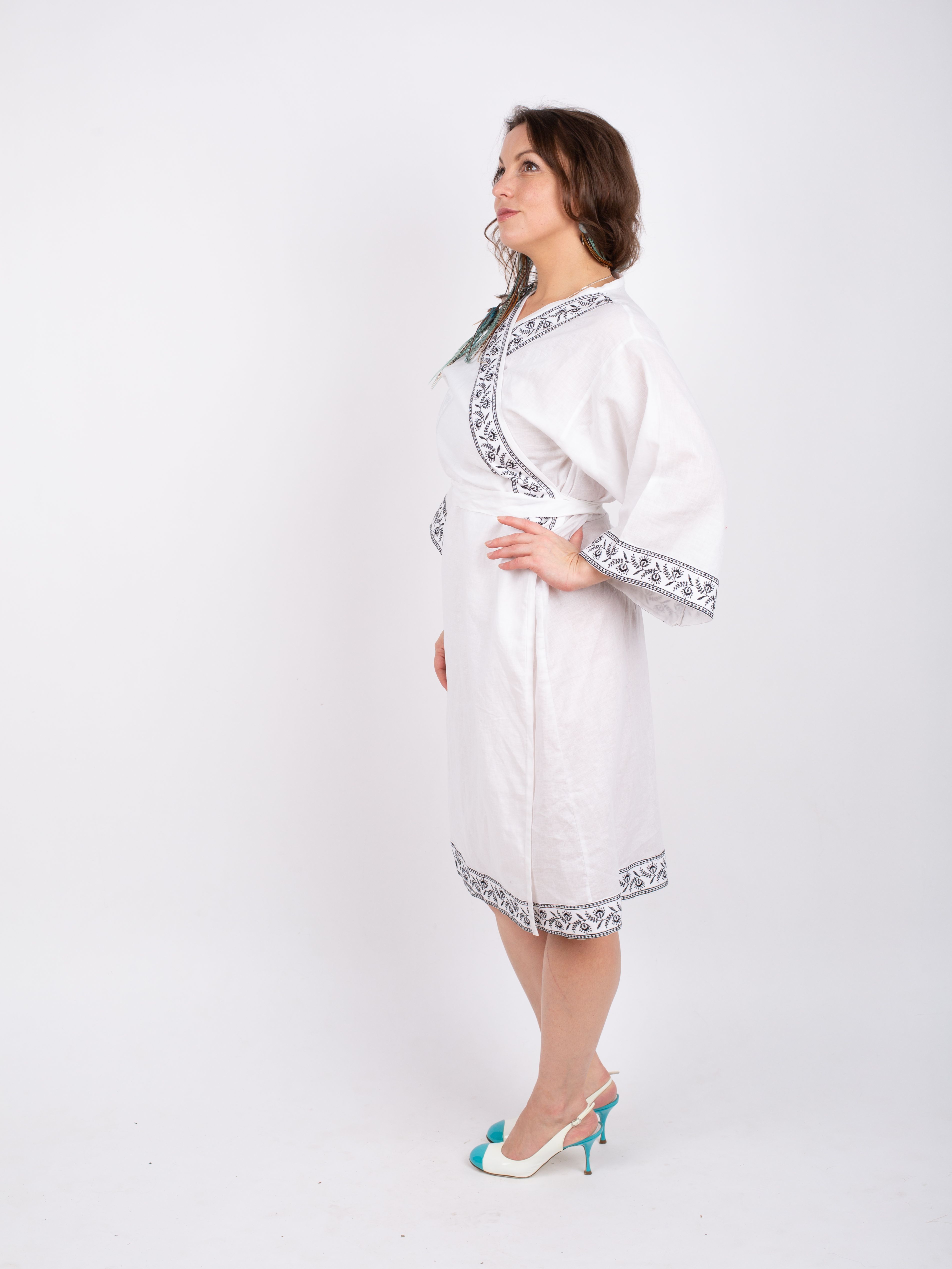 Роскошный домашний или банный халат на запах, из тонкой и очень приятной конопли. Декорирован хлопковой вышивкой по всем краям.