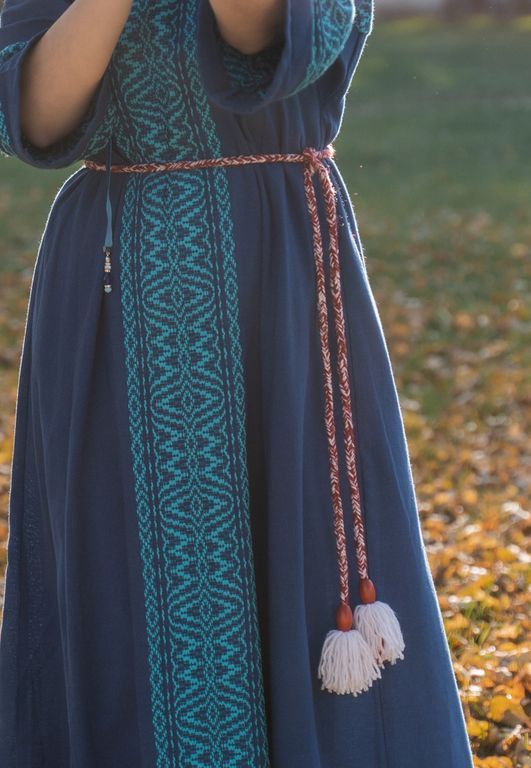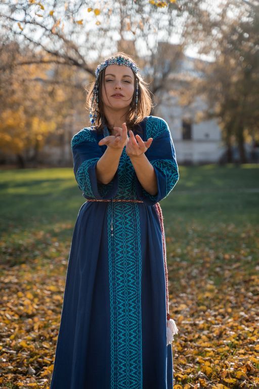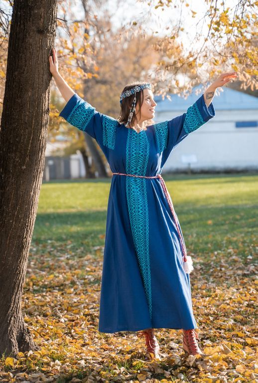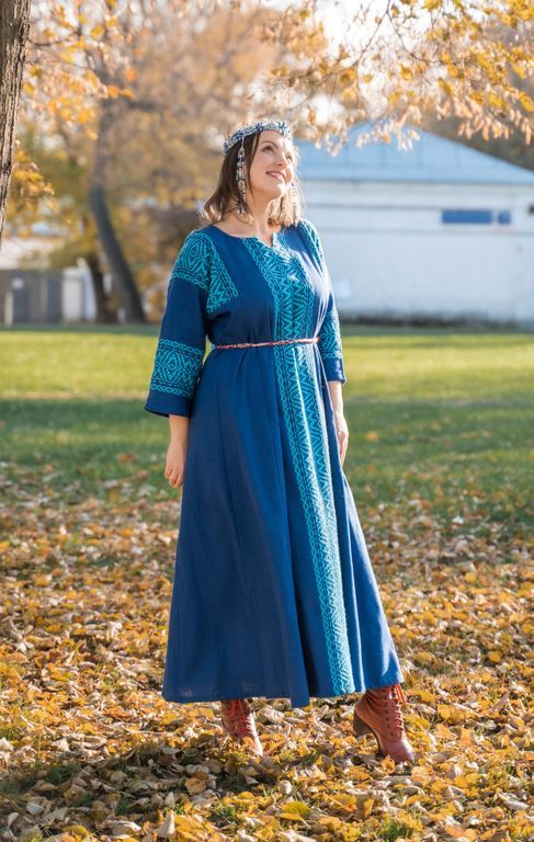 ЦветсинийДлинаВ полСтильСлавянскийРукавдлинныйВышивкаестьКружевоестьПоясестьФасонСвободное платье по русскому кроюЕдиница измеренияшт -