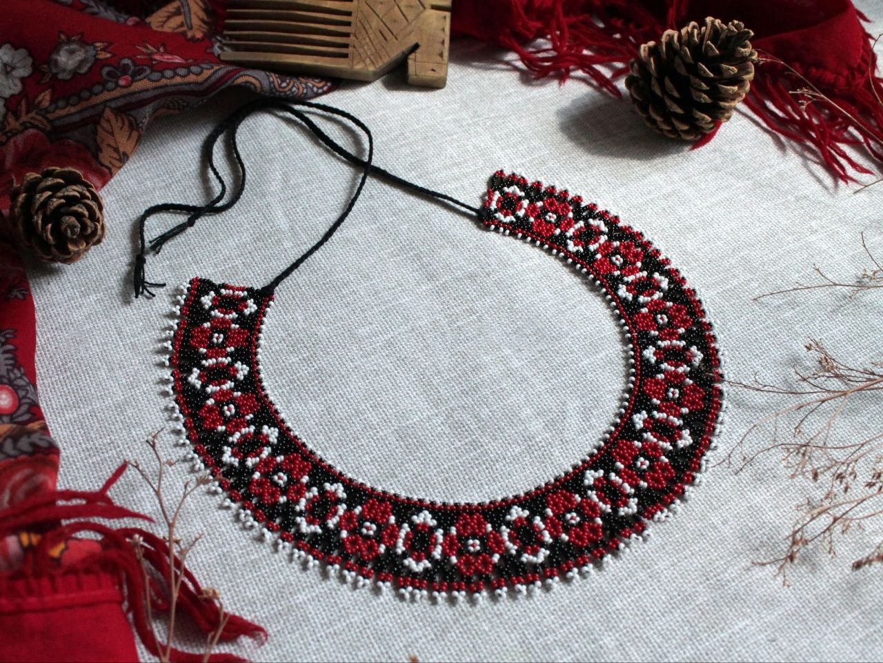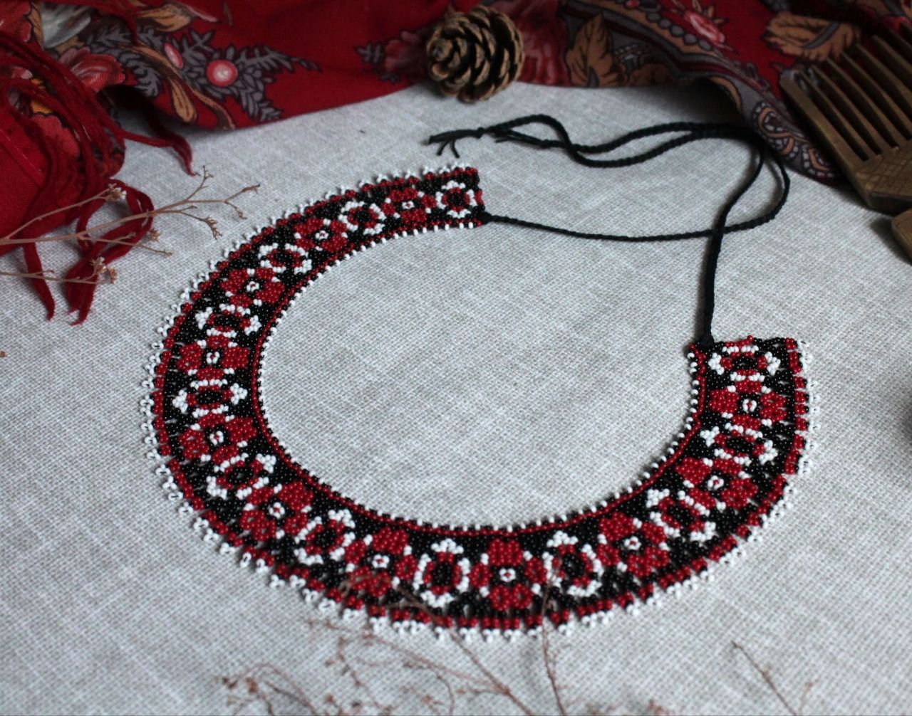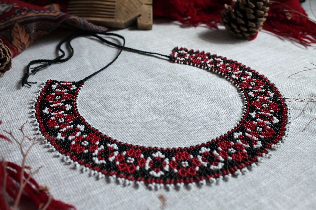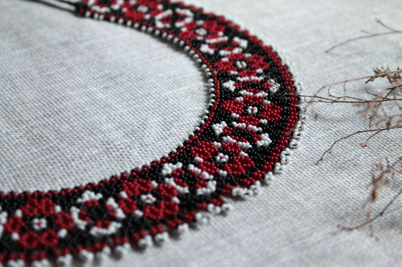 Бисерный ожерелок ручной работы в традиционных красно чёрно-белых цветах