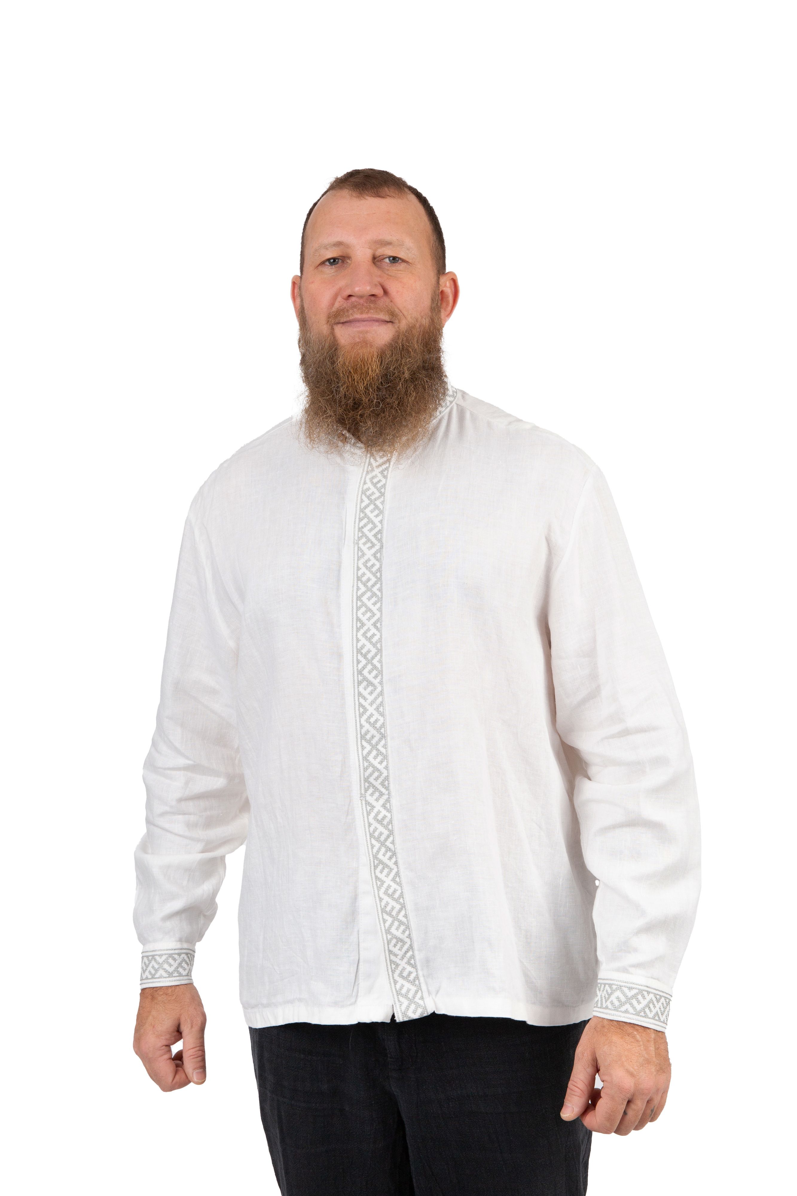 Деловая сорочка "Здрава" белый лён/серая вышивка