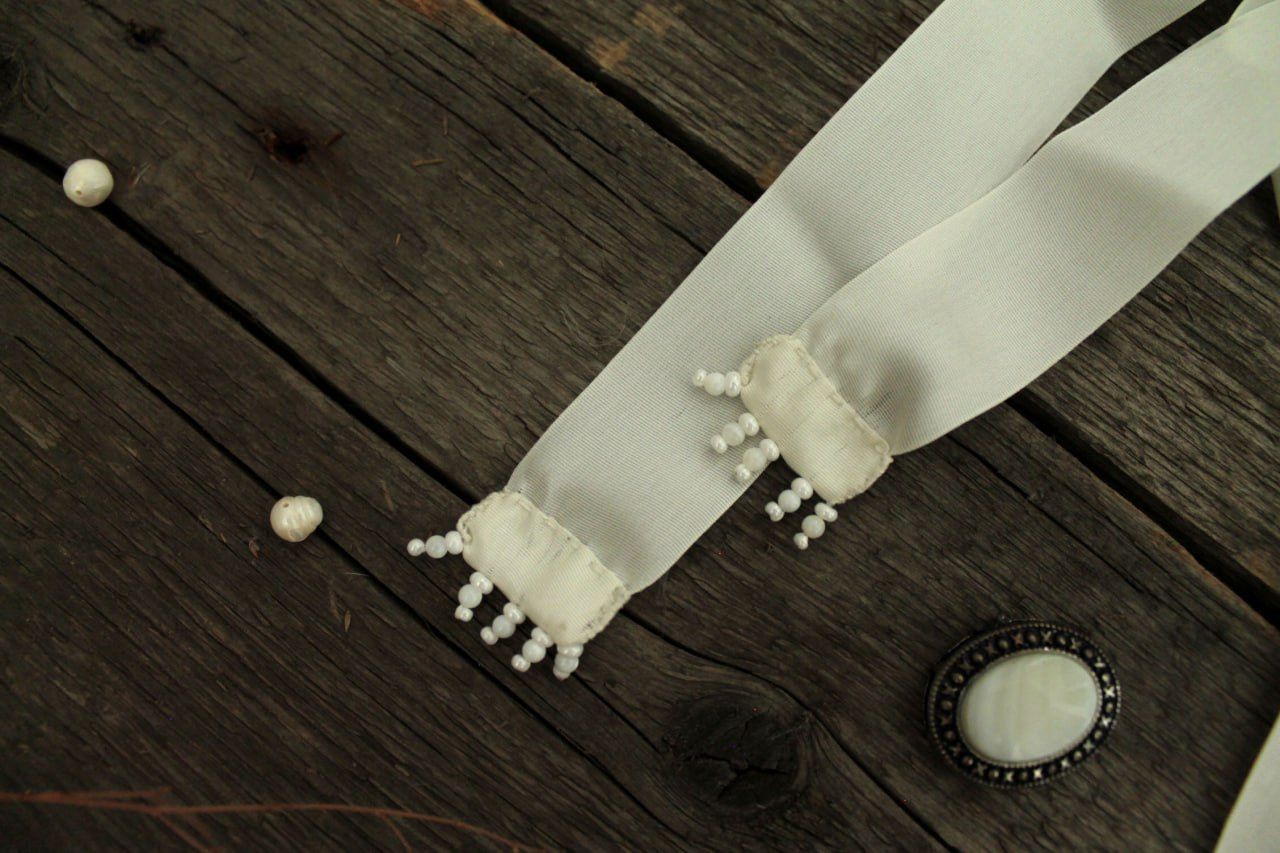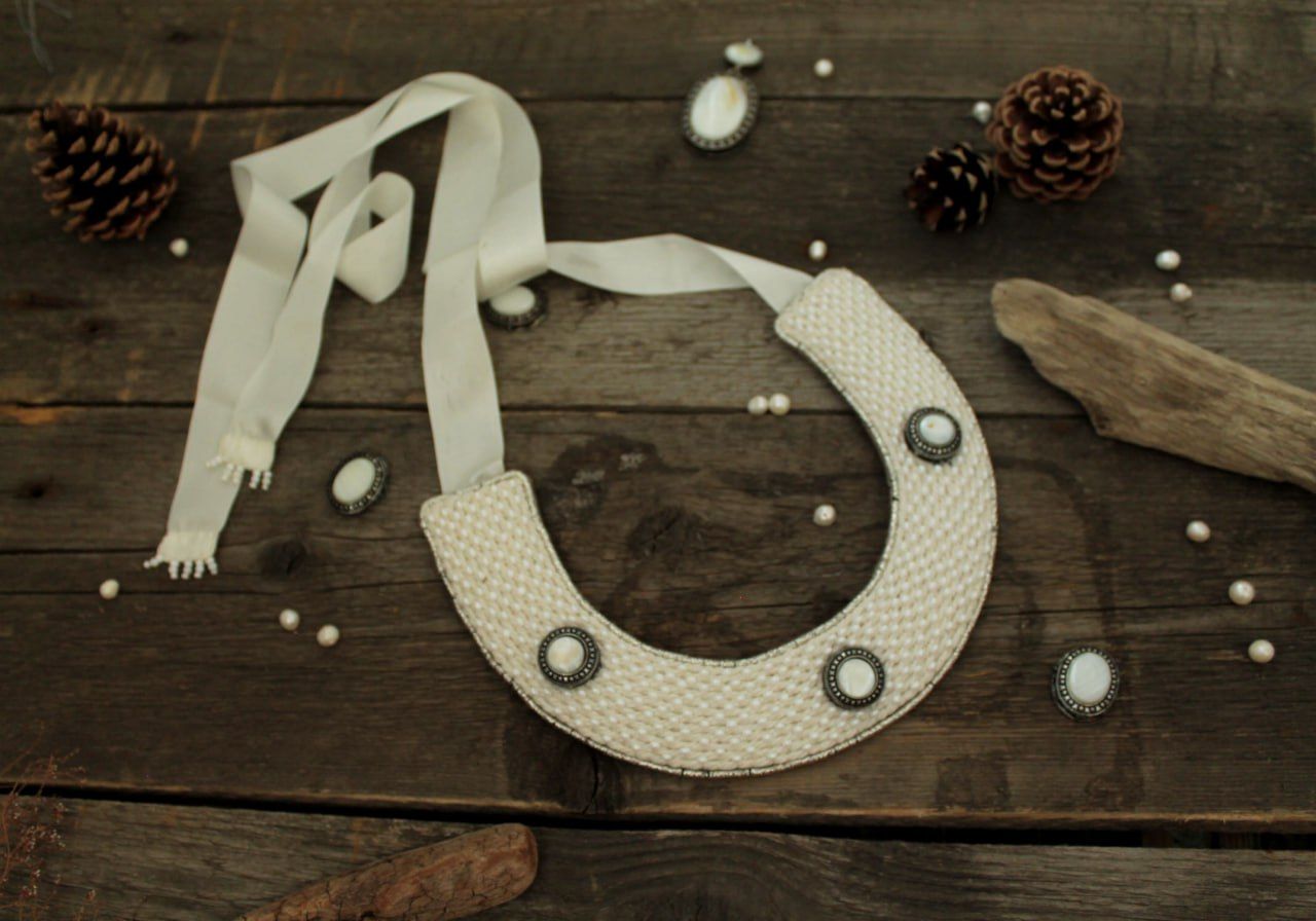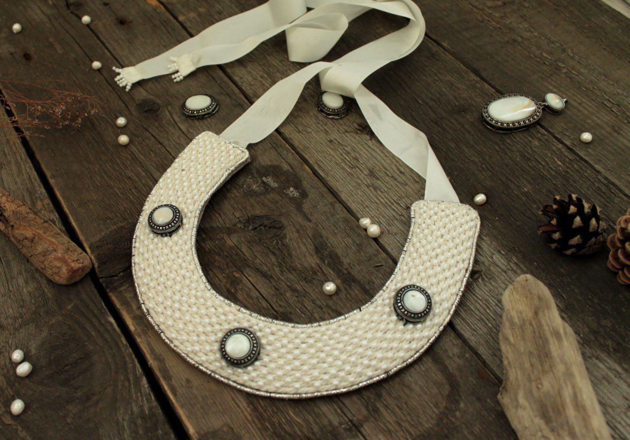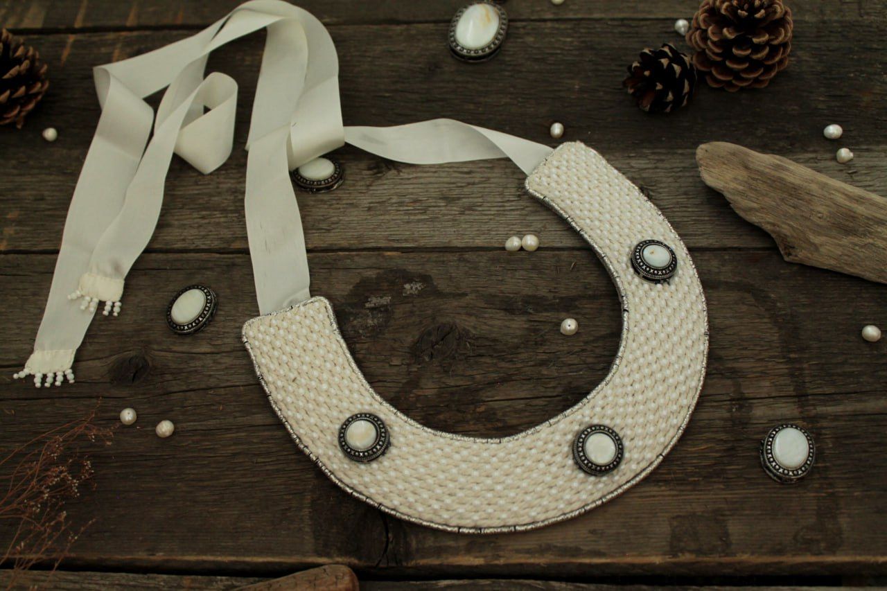 Подковообразное украшение, бытовавшее в Архангельской губернии на Летнем береге Белого моря в период с 18 и до начала 20 века. Особенность данного украшения - старинная техника "Сажение опо бели" - вышивка по белому настилу нитками (сначала вышивается основа, потом расшивается бисером)