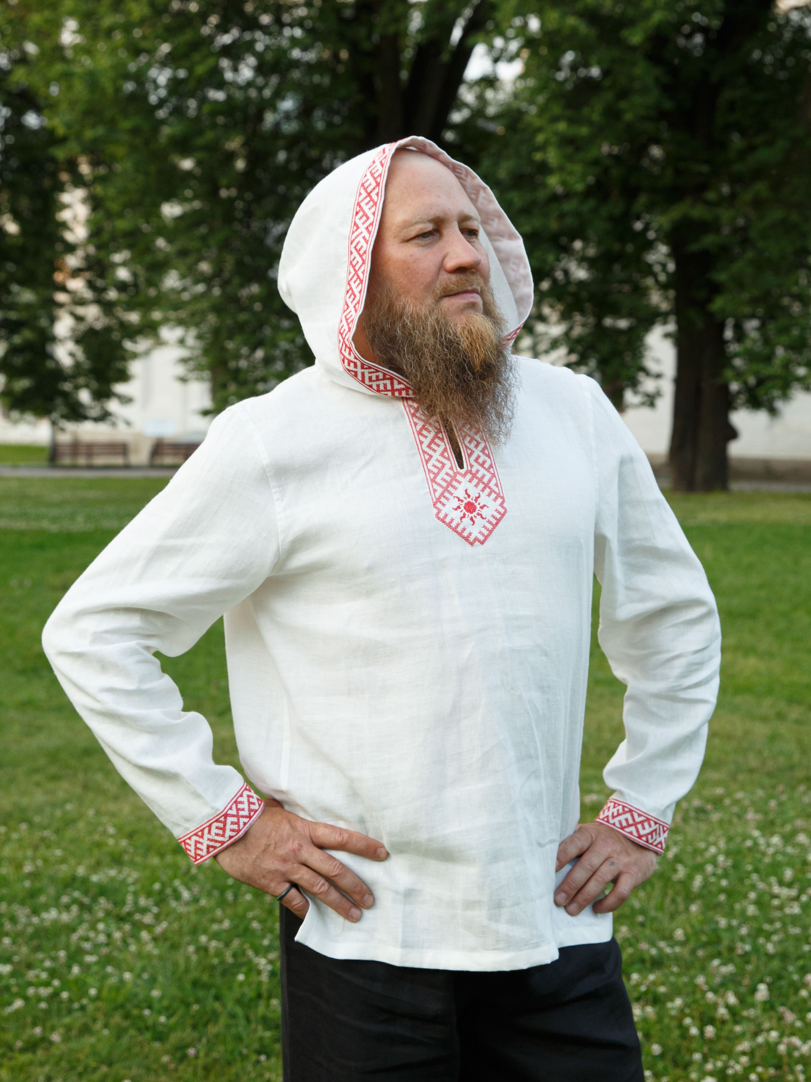 Льняная рубаха с вышивкой и капюшоном.