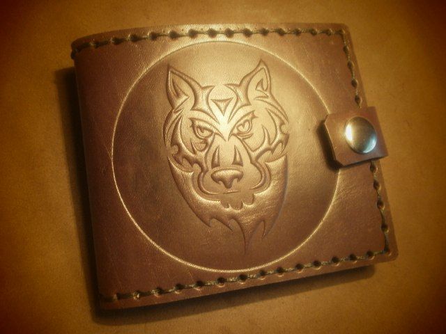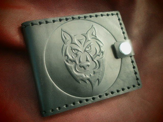 Кошелек ручной работы, прошит саожной нитью. На кошельке изображон Волк, как символ наступившего утра, пробуждения и объеденение Рода. Два отделения для купюр, отделение для карточек, отделение для мелочи.