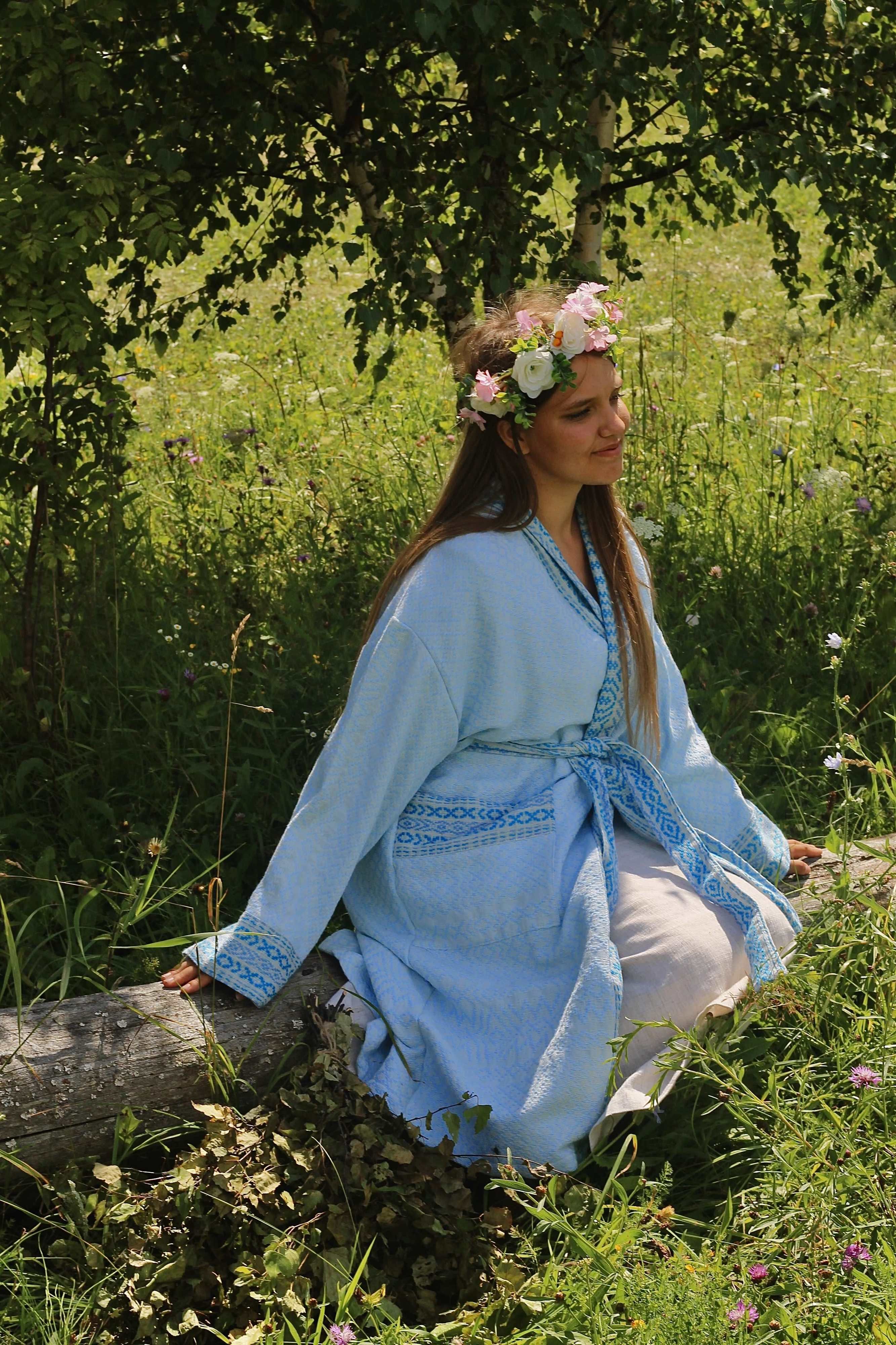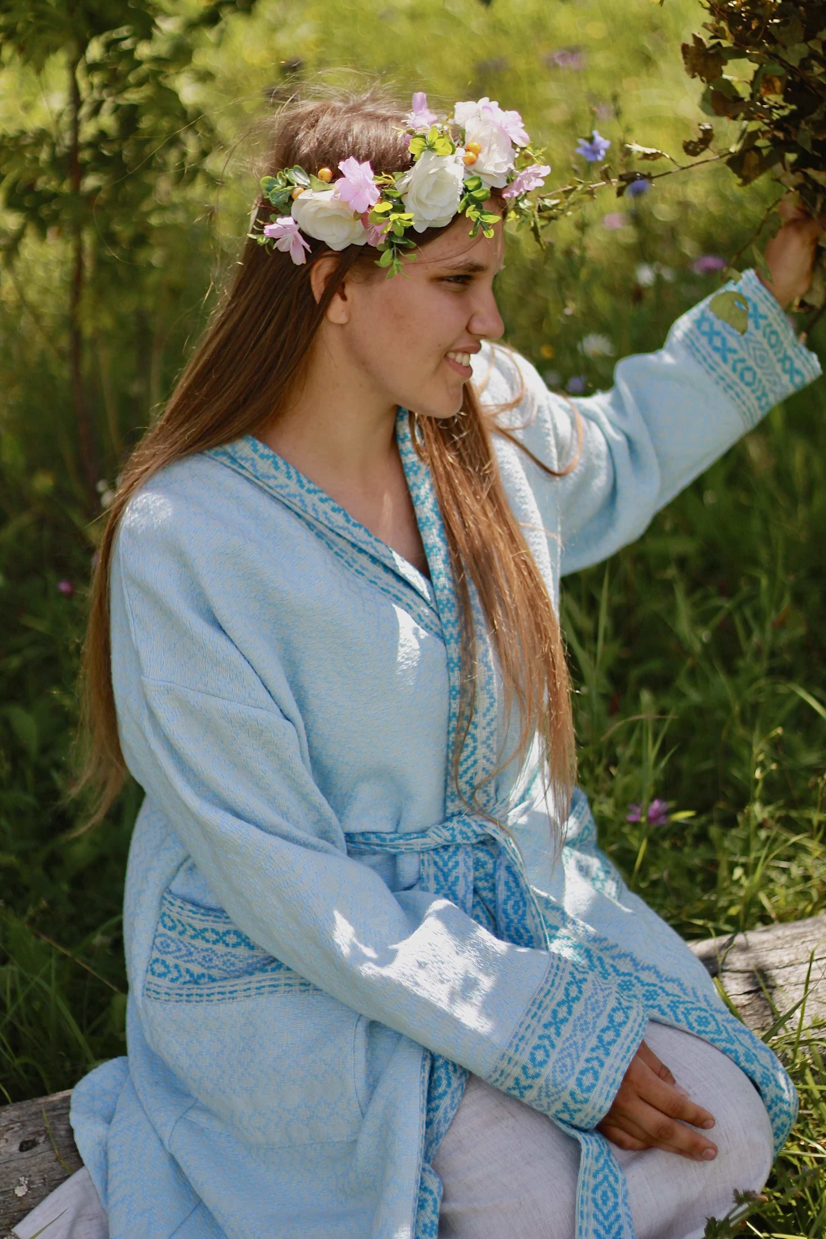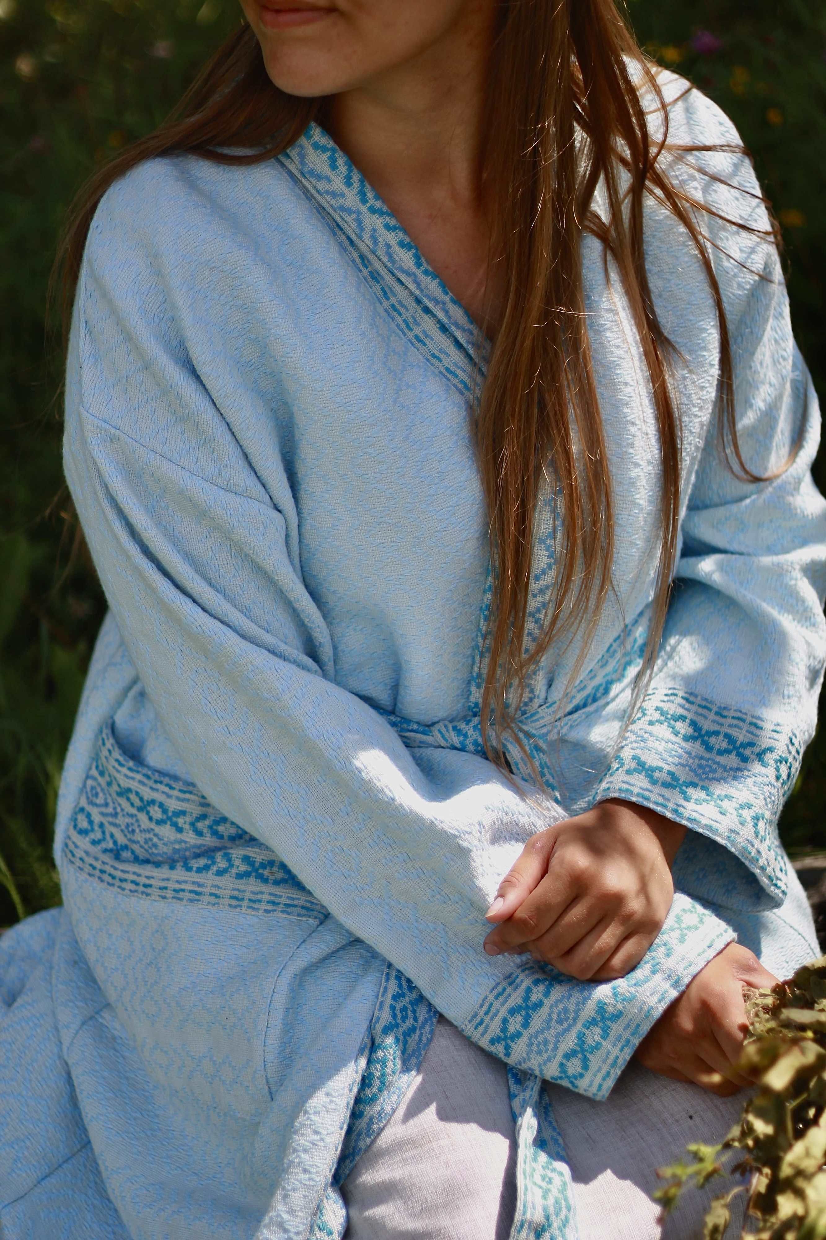 Ручное ткачество - одежда высоких вибраций, в которой чувствуешь себя божественно. Халат женский для бани "Уют" в голубом цвете - уникален орнаментом по всей ткани.
