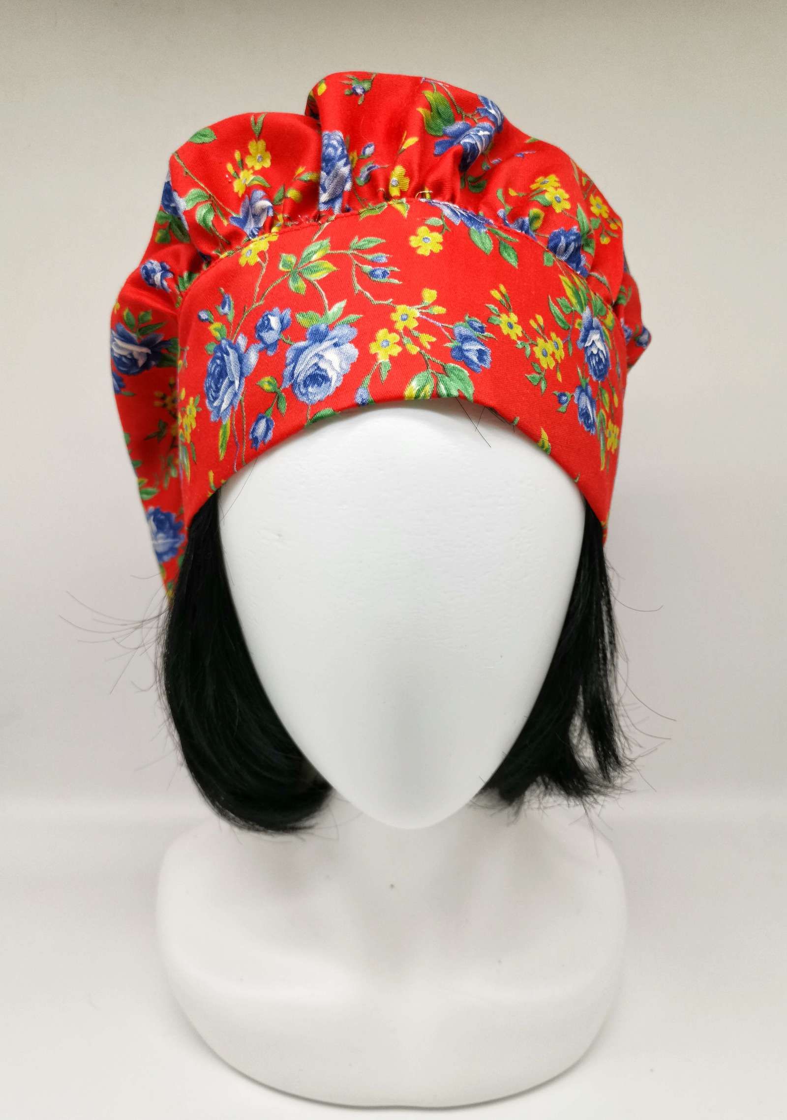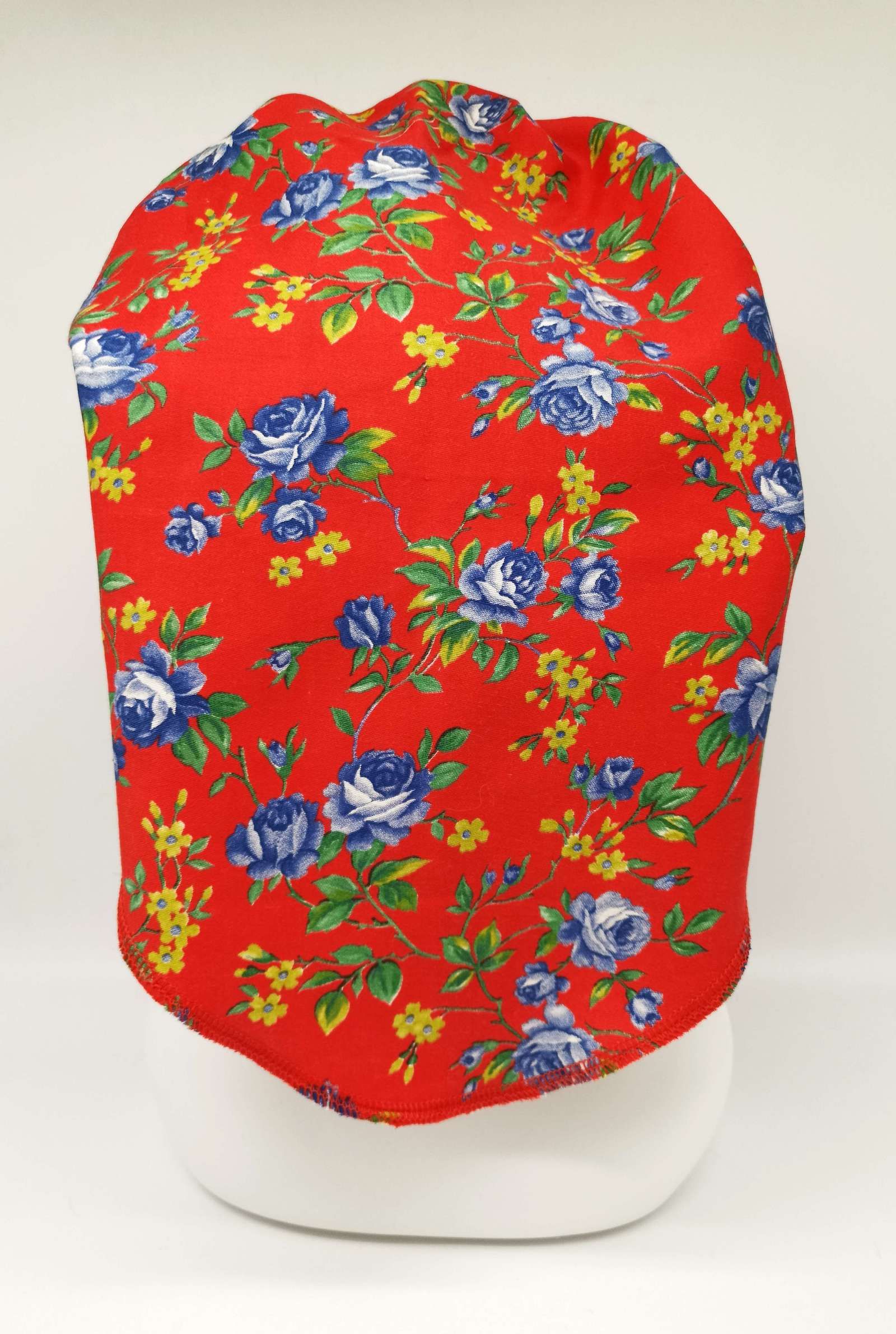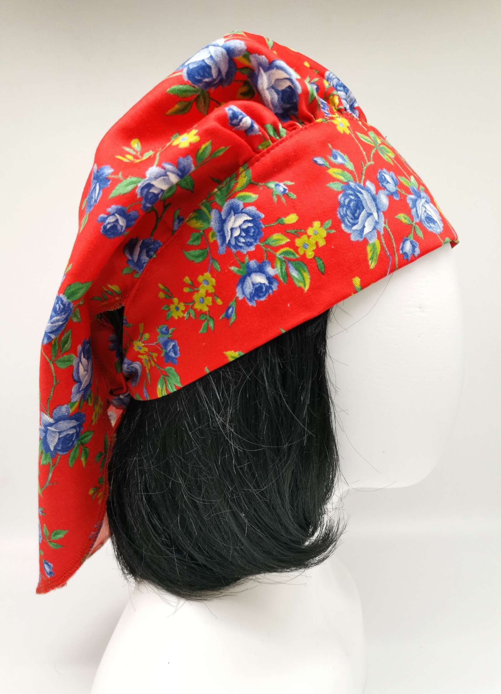 Современный повойник из хлопка яркого красного цвета с голубыми розами, желтыми колокольчиками и зелеными веточками. Яркий и нежный головной убор для замужней женщины.