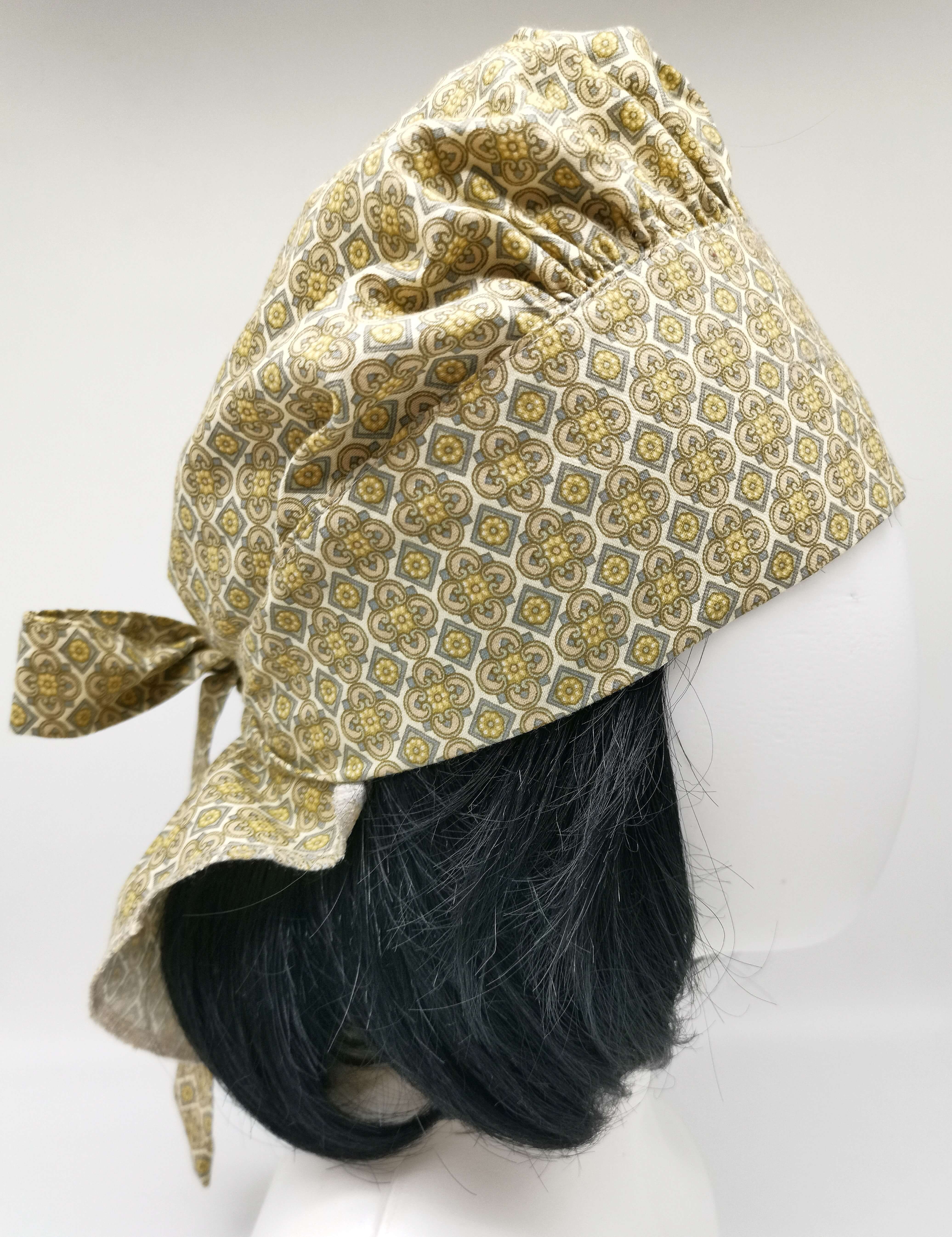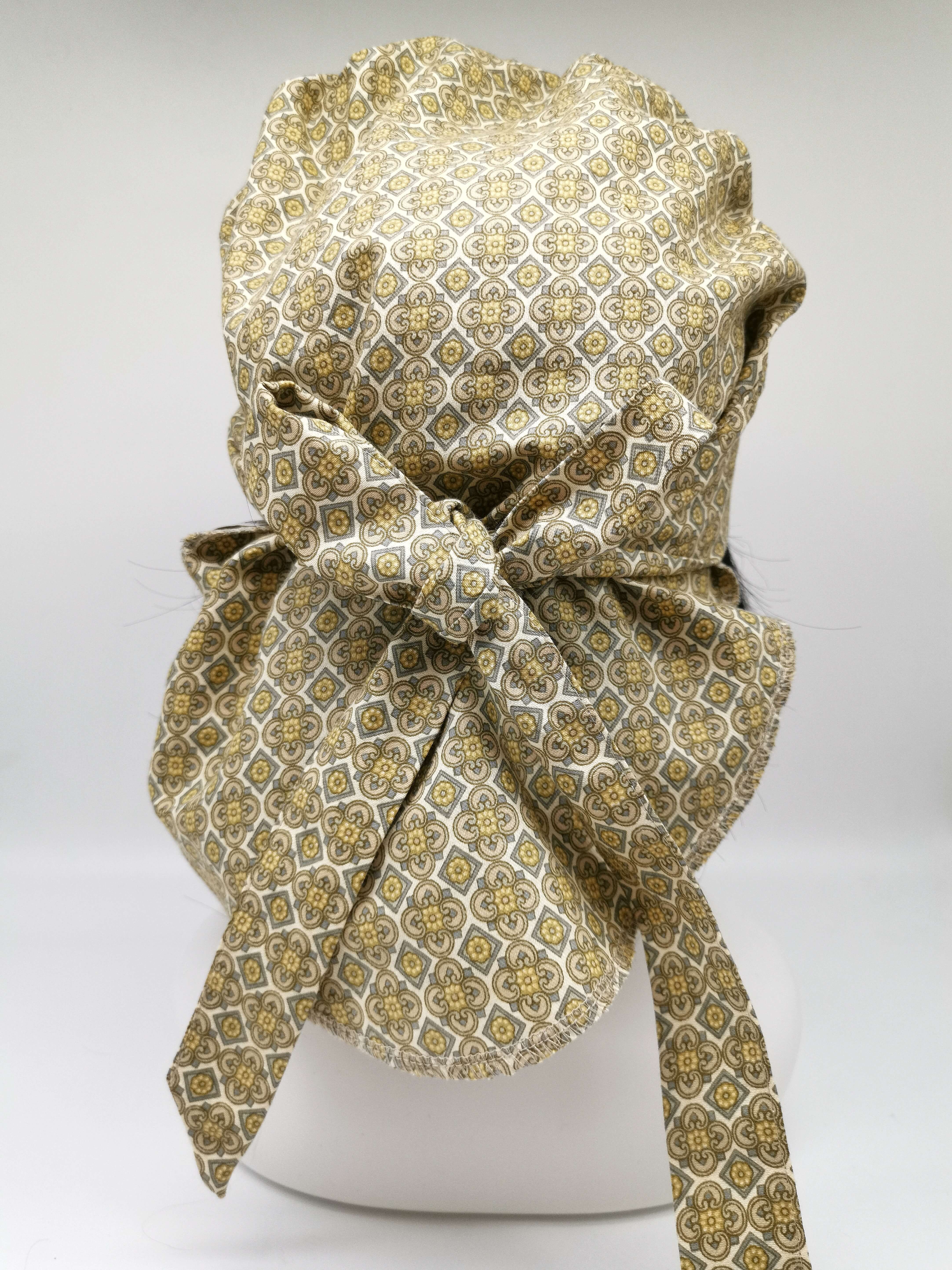 Современный повойник из хлопка красивого цветого сочетания: бежевый, нежно-желтый и светло-голубой.