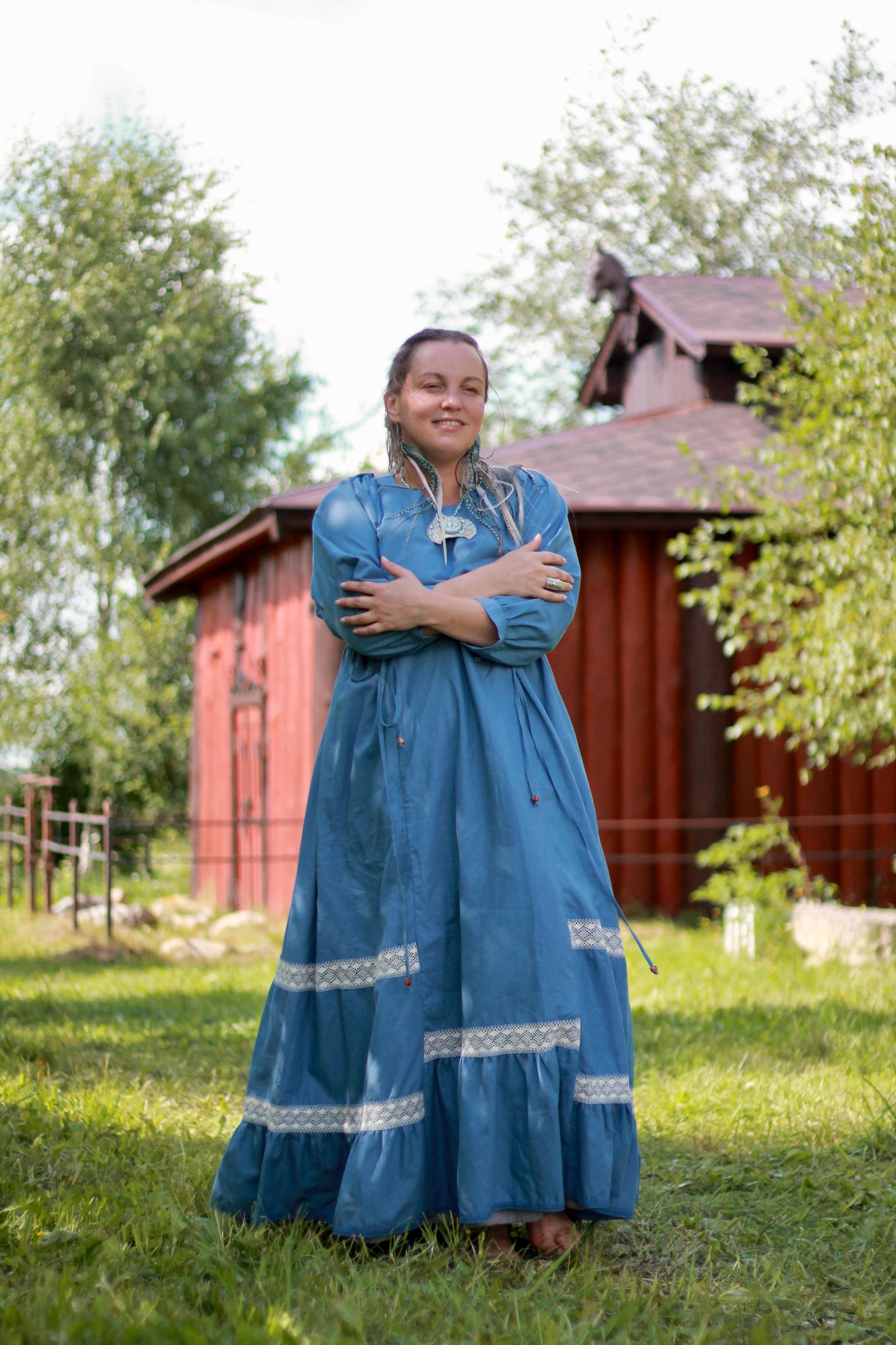 Размер54ЦветсинийДлинаВ полСтильТрадиционно-народныйРукав3/4ВырезкруглыйСоставконопля 80%/хлопок 20%КружевоестьФасонСвободное платье по русскому кроюСилуэтсвободныйЕдиница измеренияшт -