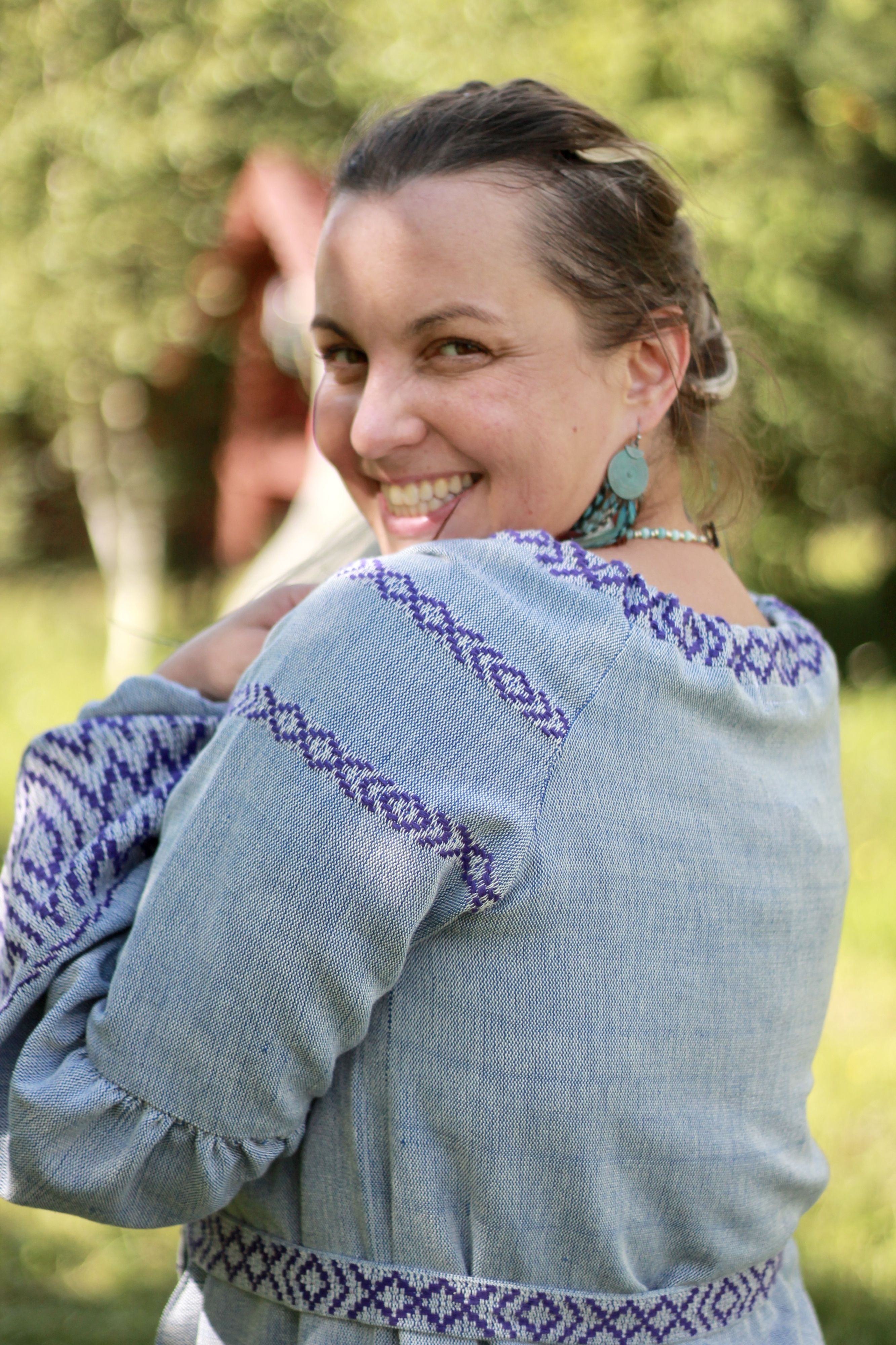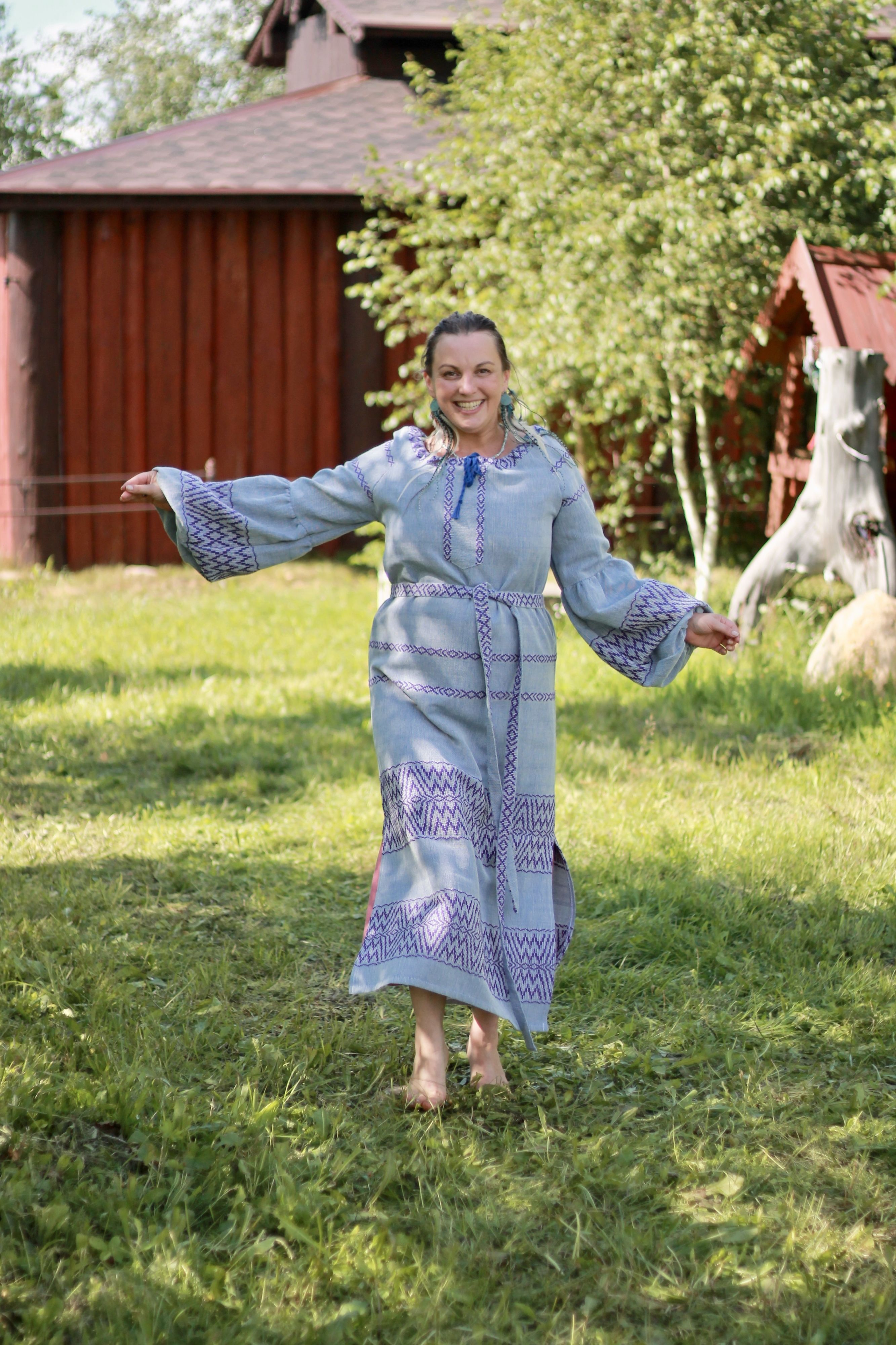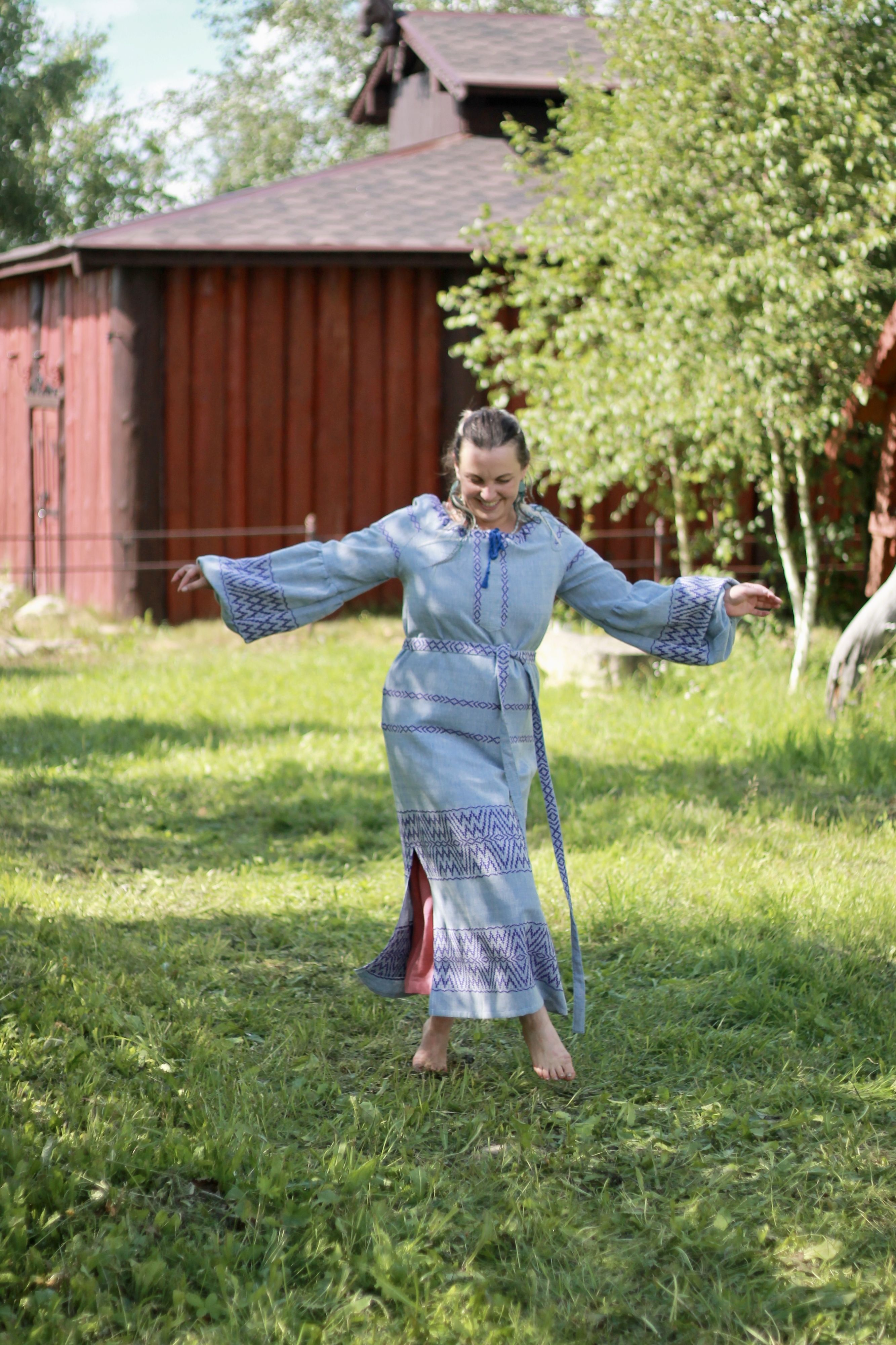 Платье выполнено по типу покосной рубахи, его можно носить самостоятельно в повседневной жизни.